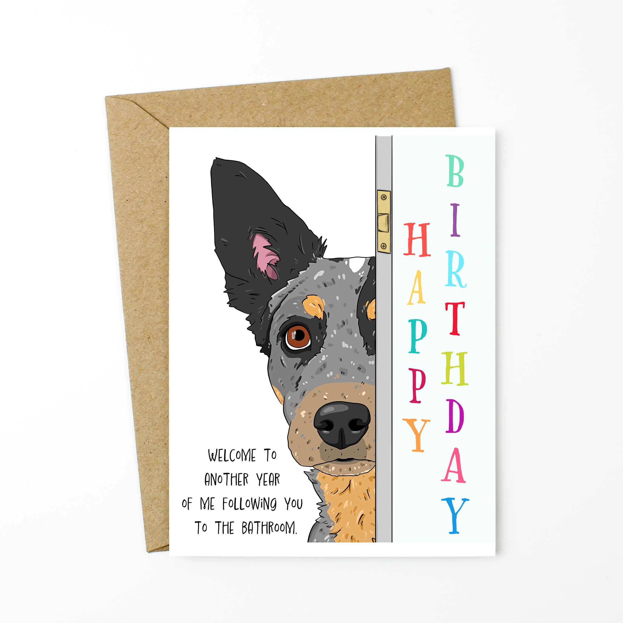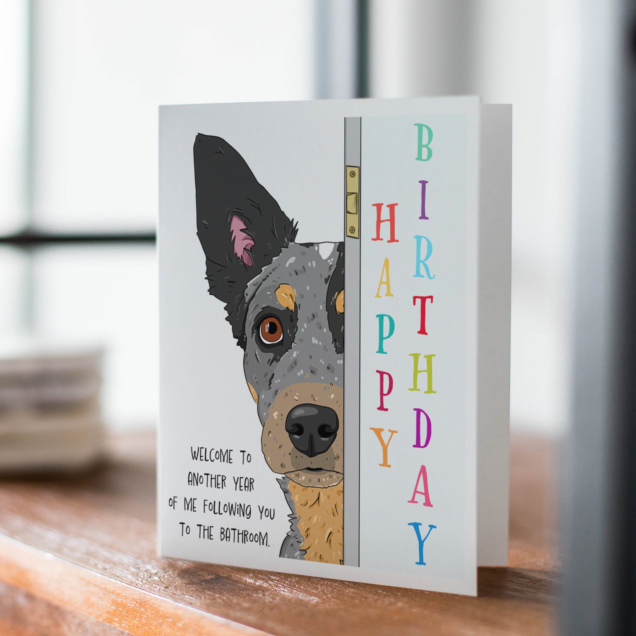 A blue heeler dog is featured in this funny happy birthday card that let's the recipient know that for another year they'll be following you to the bathroom. This is the perfect birthday card for the dog love in your life and is sure to get a few chuckles.