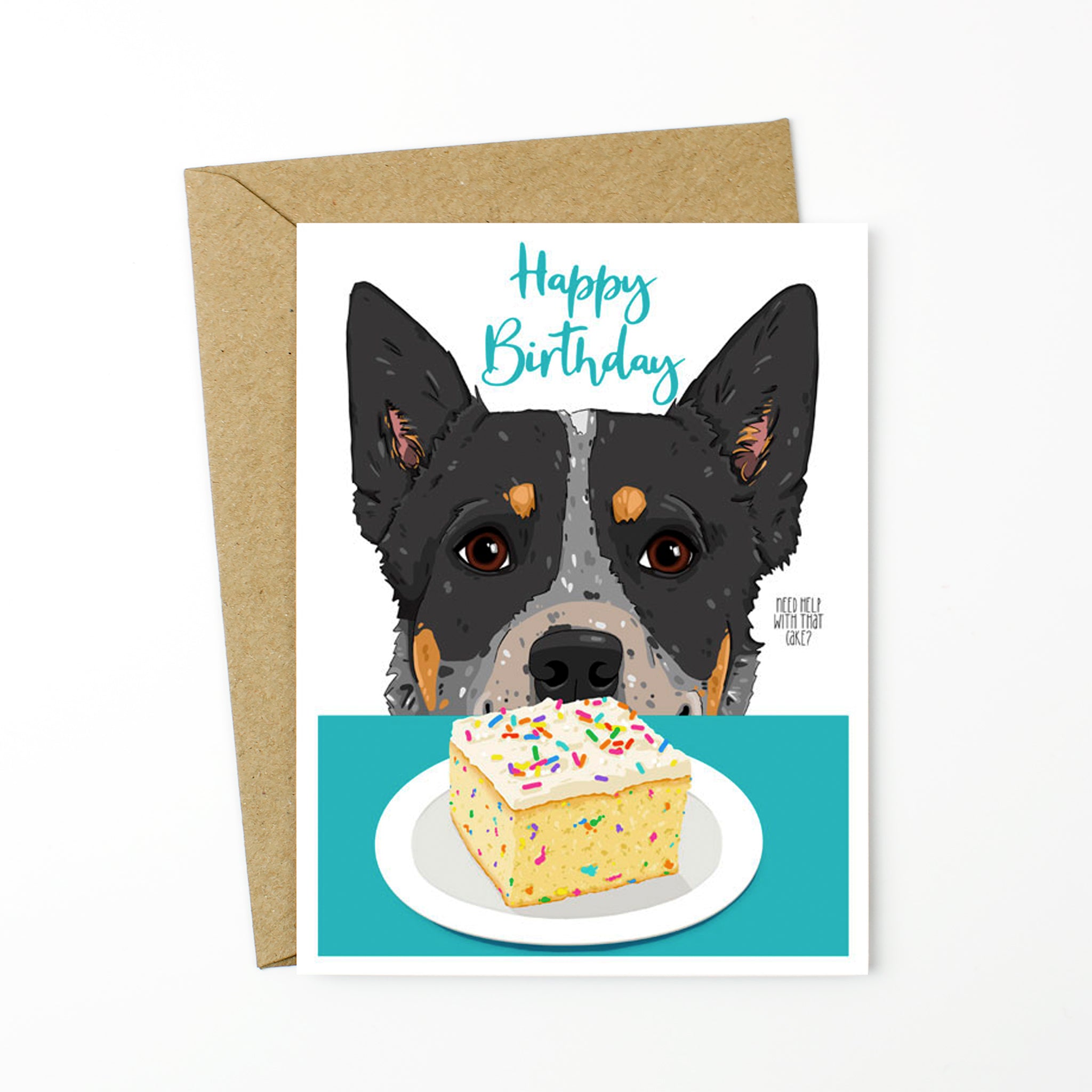 A blue heeler cattle dog is ready to help with a slice of cake if needed... they're super helpful that way! This birthday card is perfect for the dog mom or dad in your life.