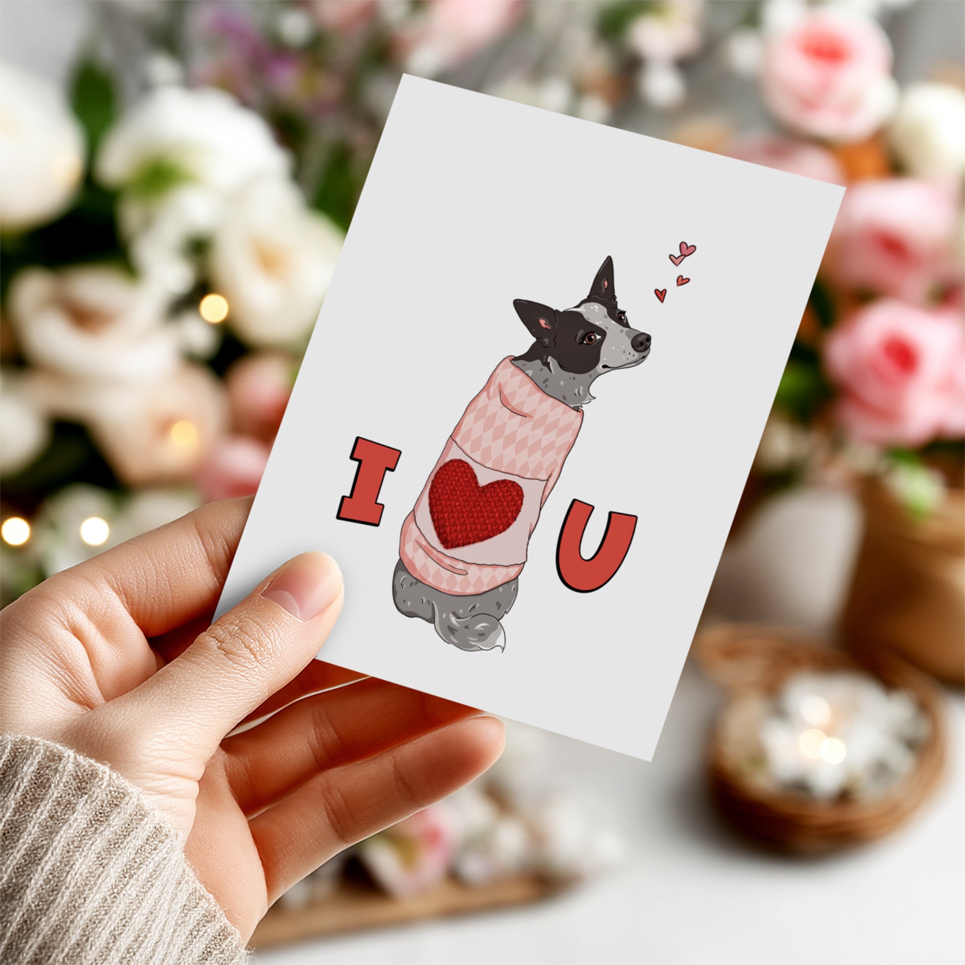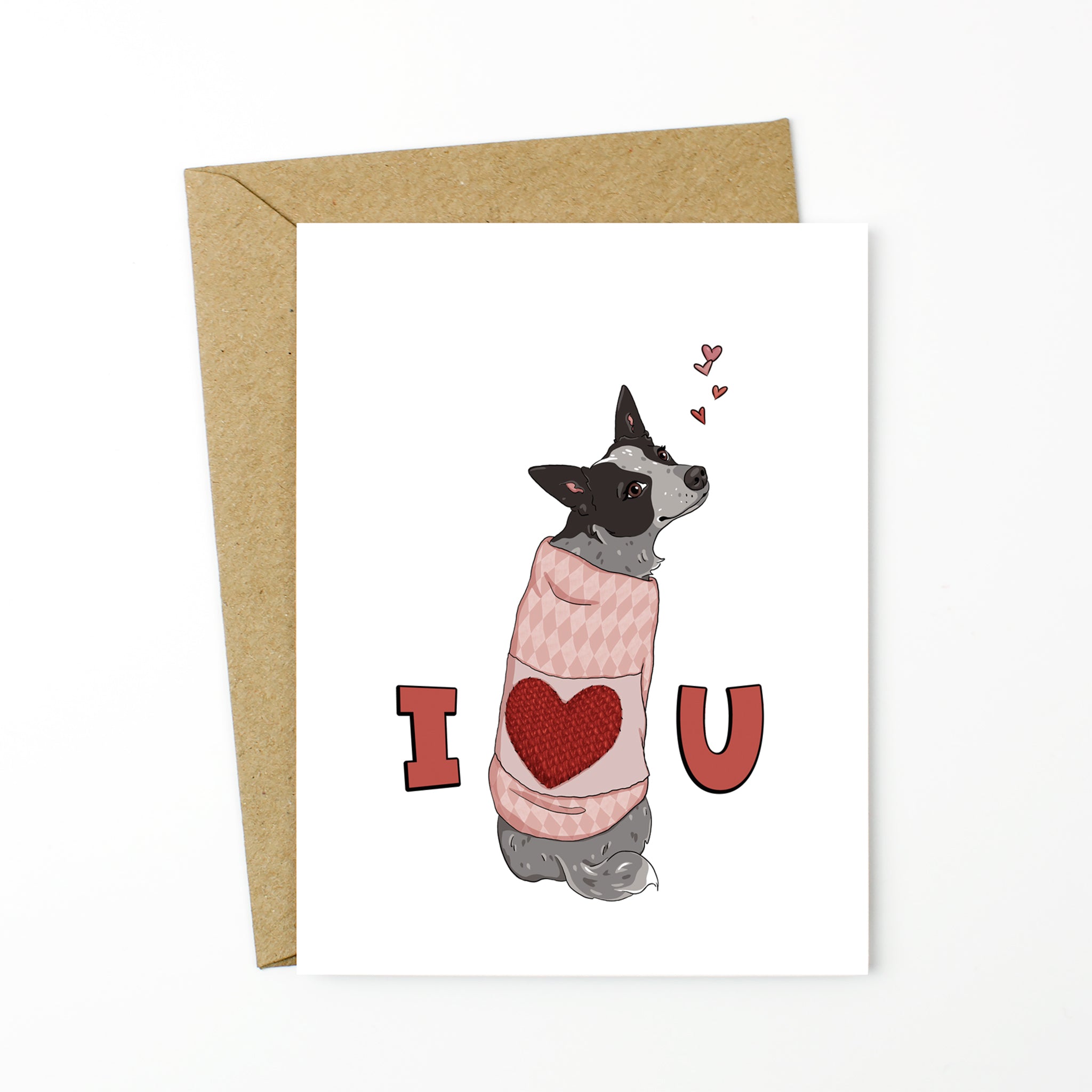 A cattle dog in a sweet heart sweater makes for the perfect greeting card gift to send a sweet note of love to someone any time of the year.