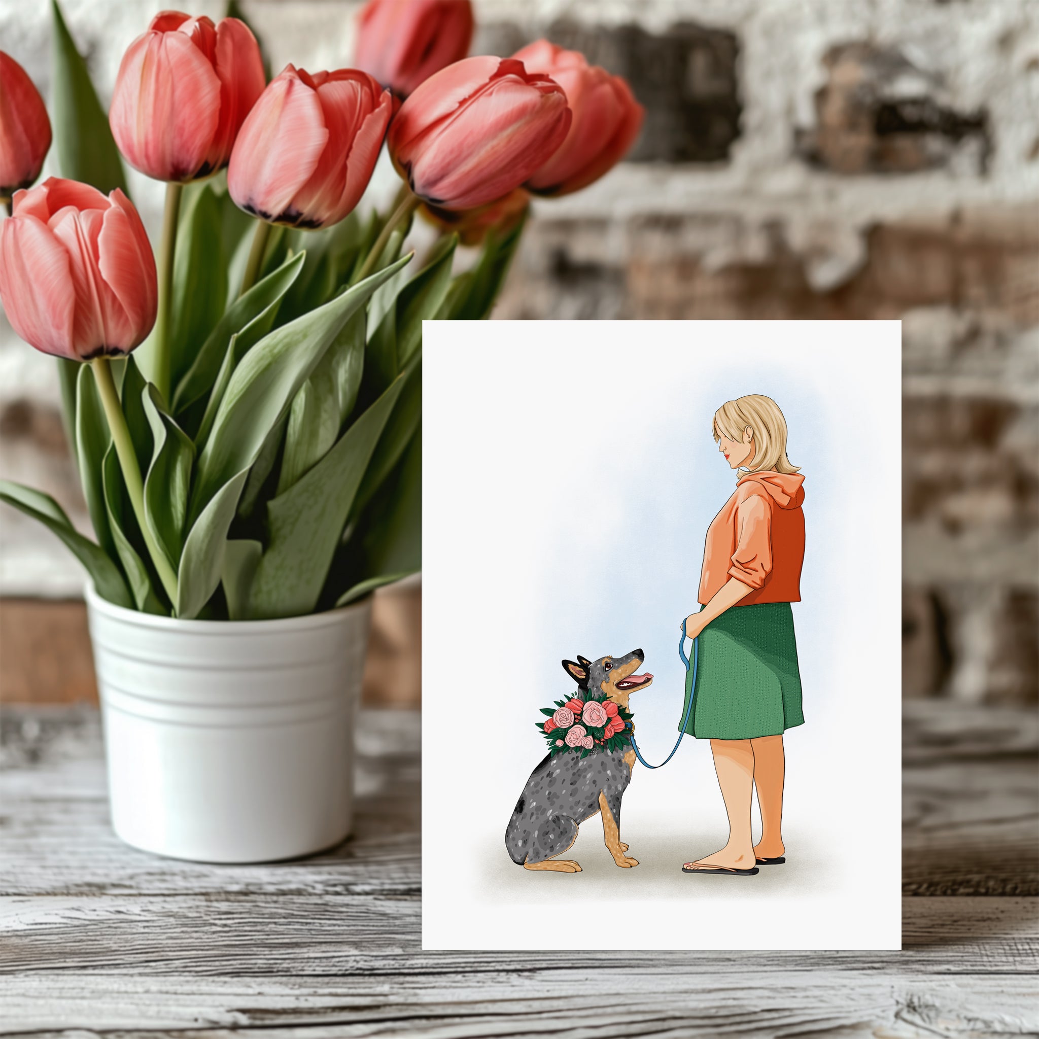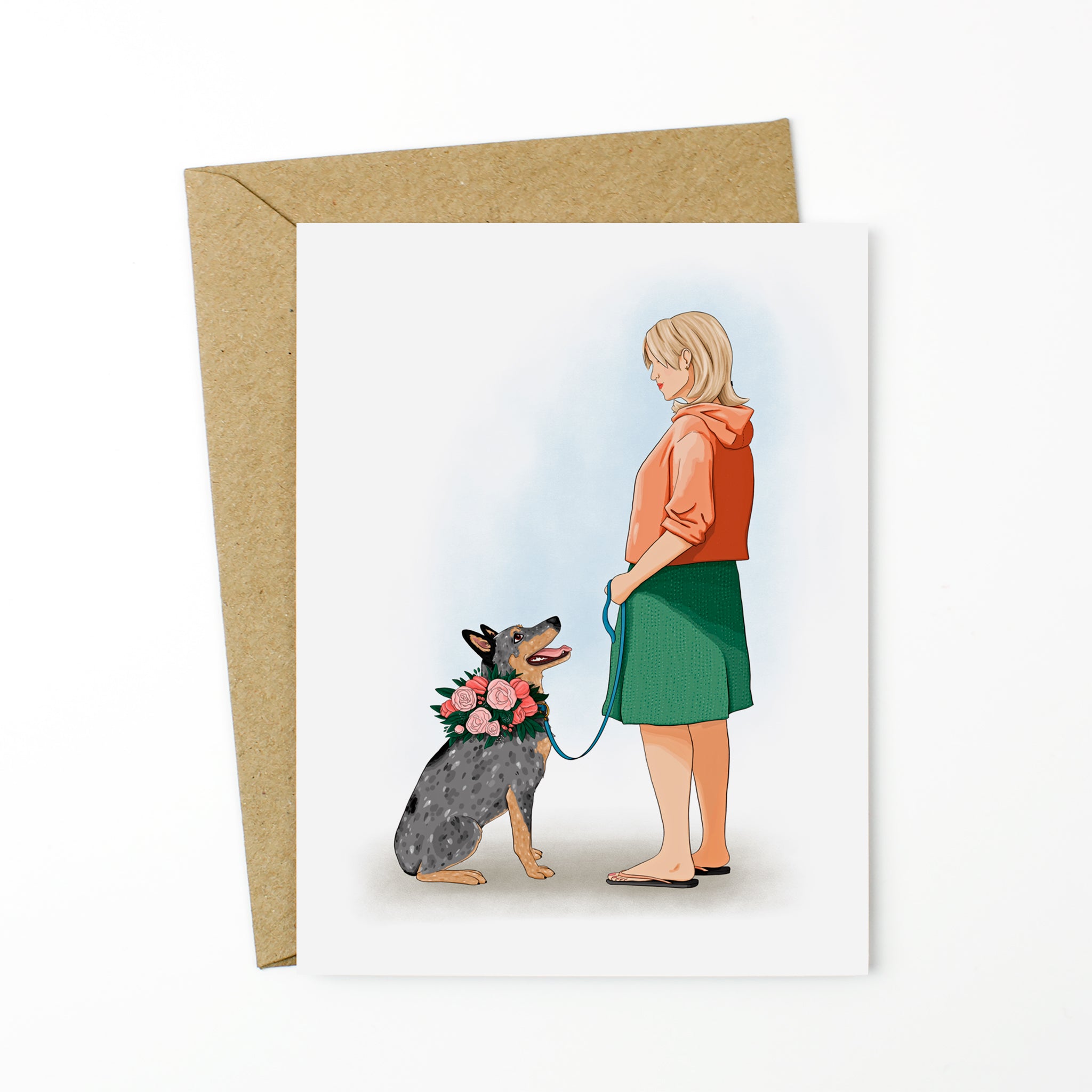 This beautifully designed card features a loving Cattle Dog Mom in a green skirt, with her adoring Blue Heeler adorned in flowers, gazing up at her with devotion.
