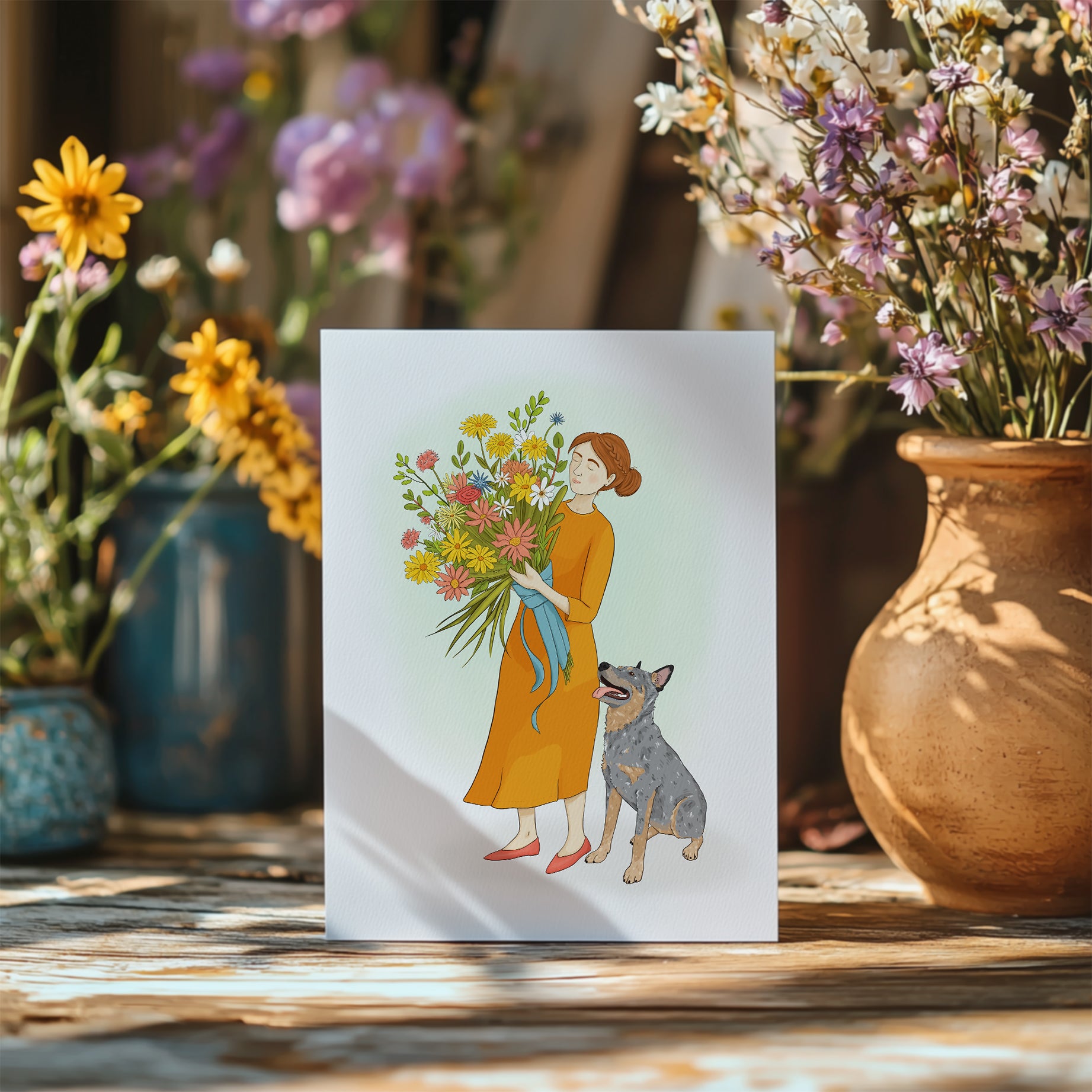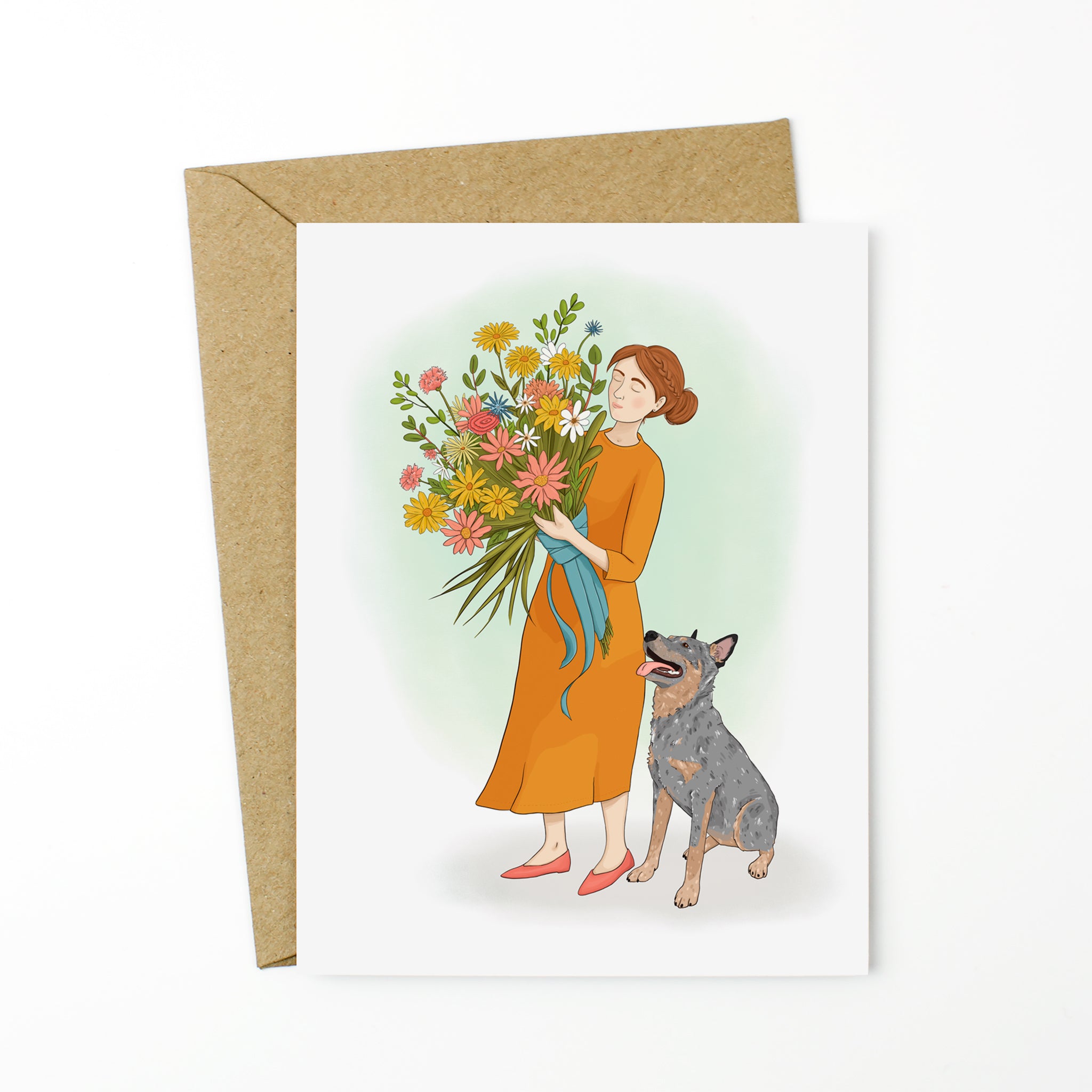 The card features an affectionate Cattle Dog Mom in an orange dress, holding a beautiful large bouquet of flowers, while her loyal Blue Heeler looks up at her with adoration.