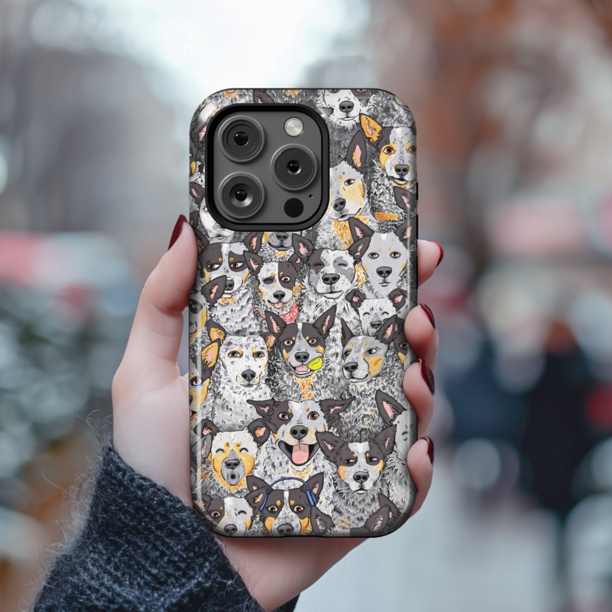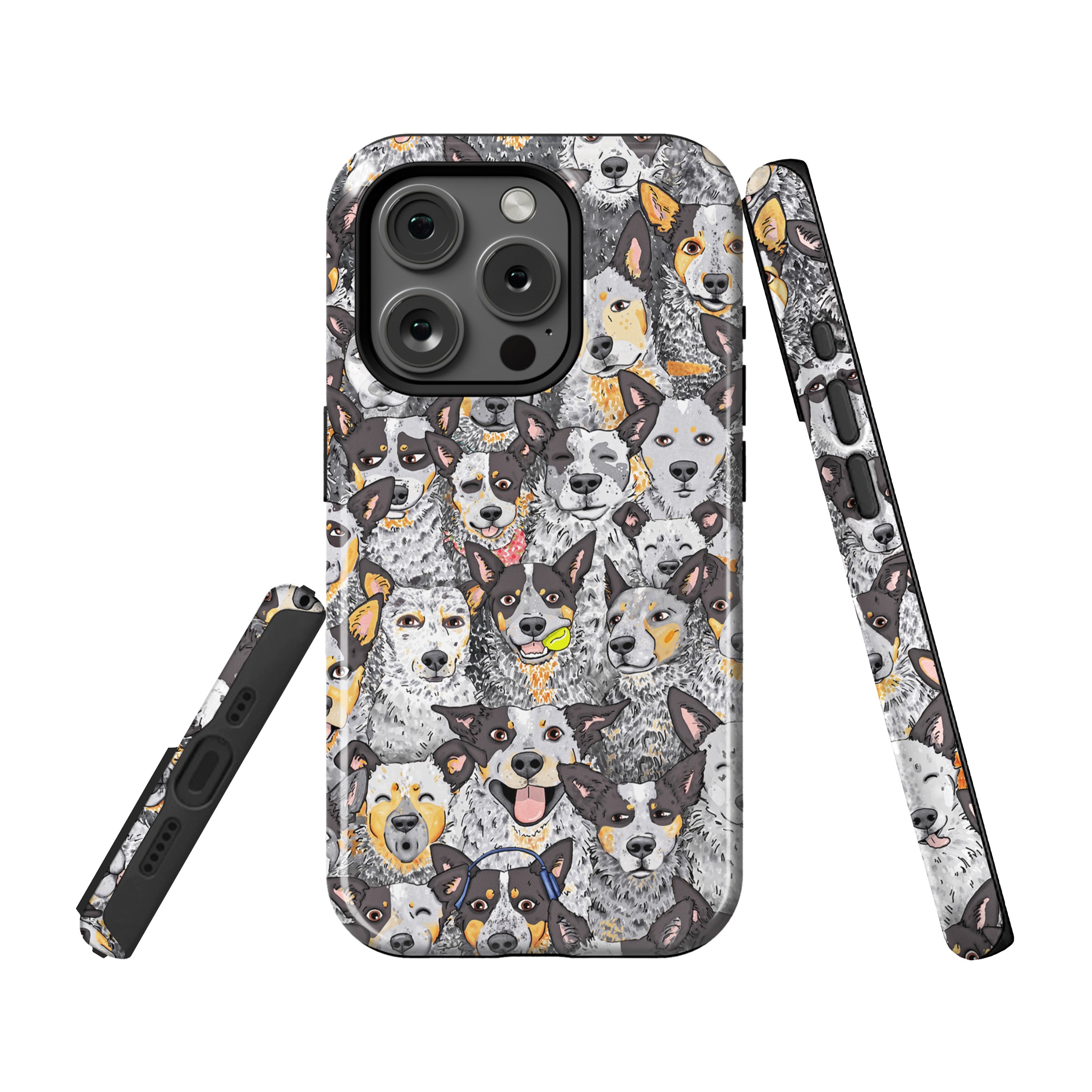 A fun cattle dog all-over-print of adorable blue heelers faces appear on this unique phone case for iPhones.