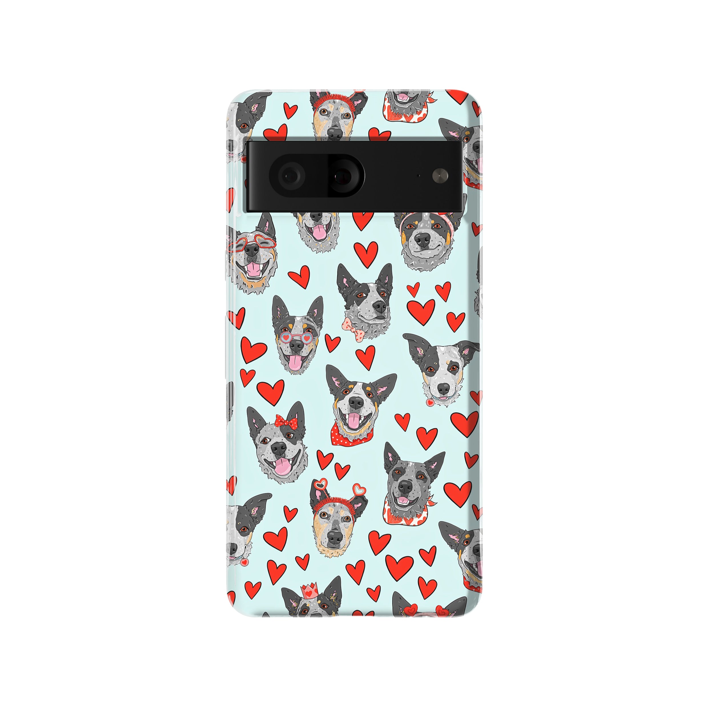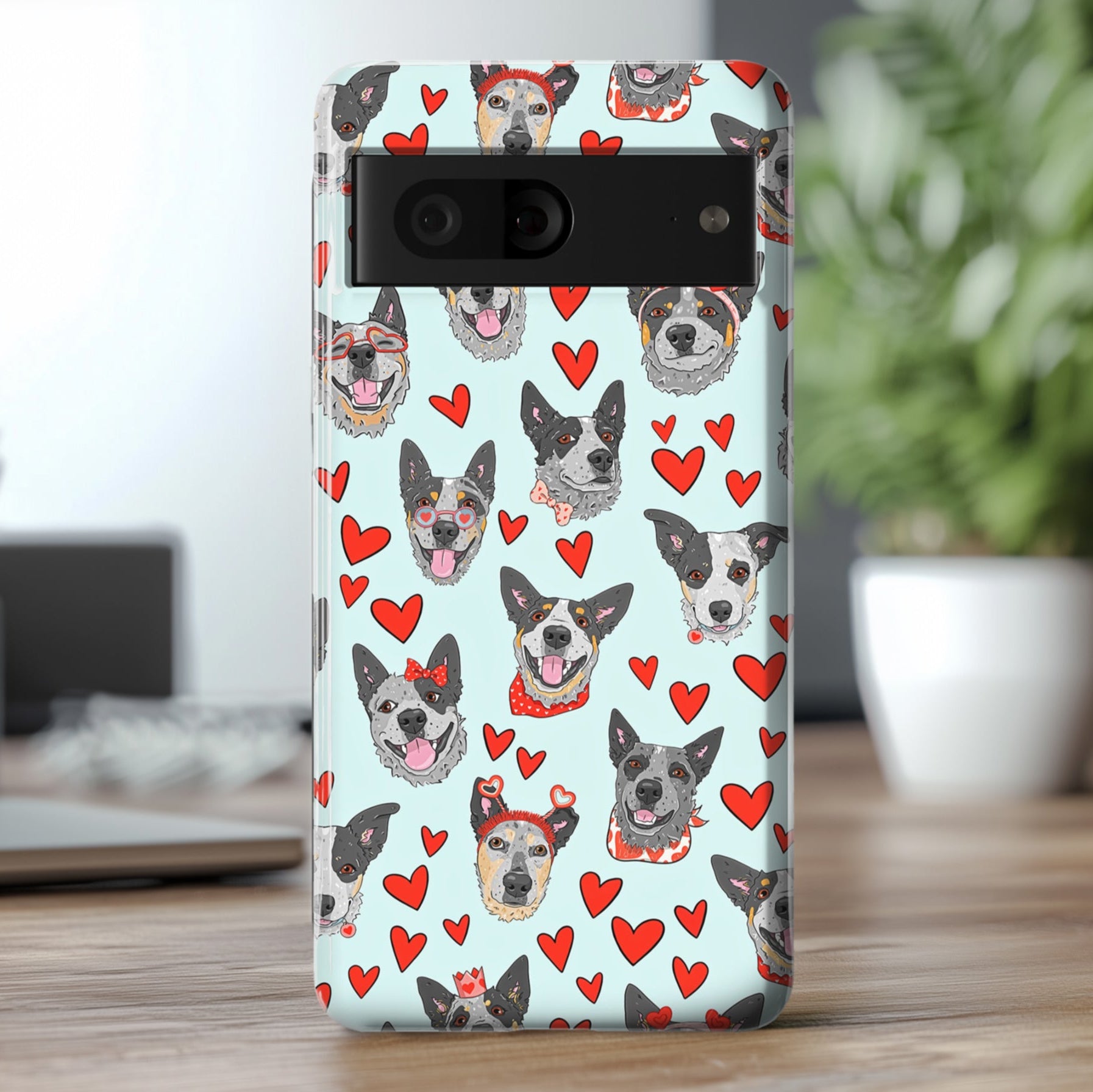 A sweet pattern of happy blue heeler dog faces and hearts.