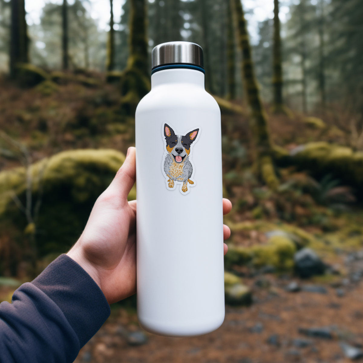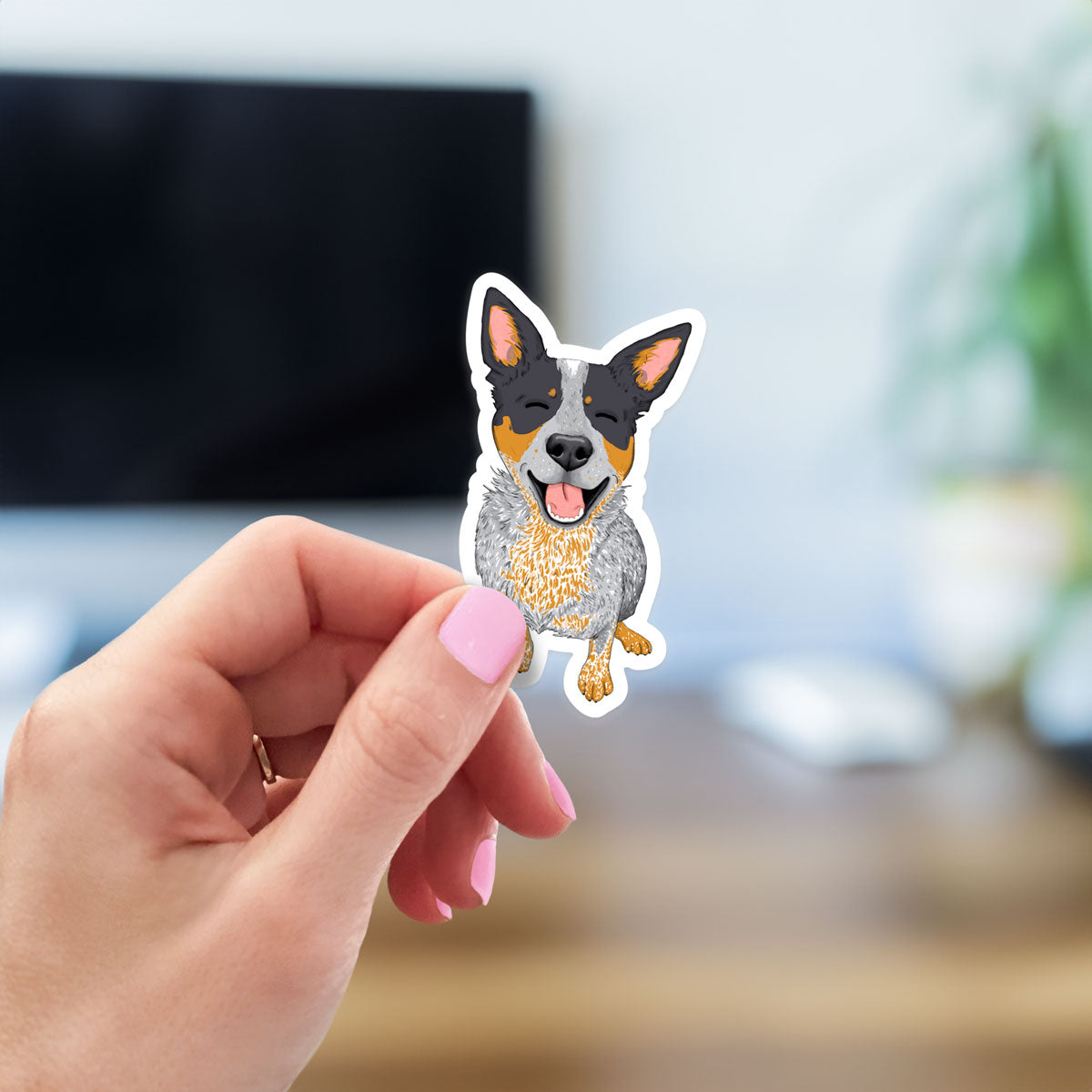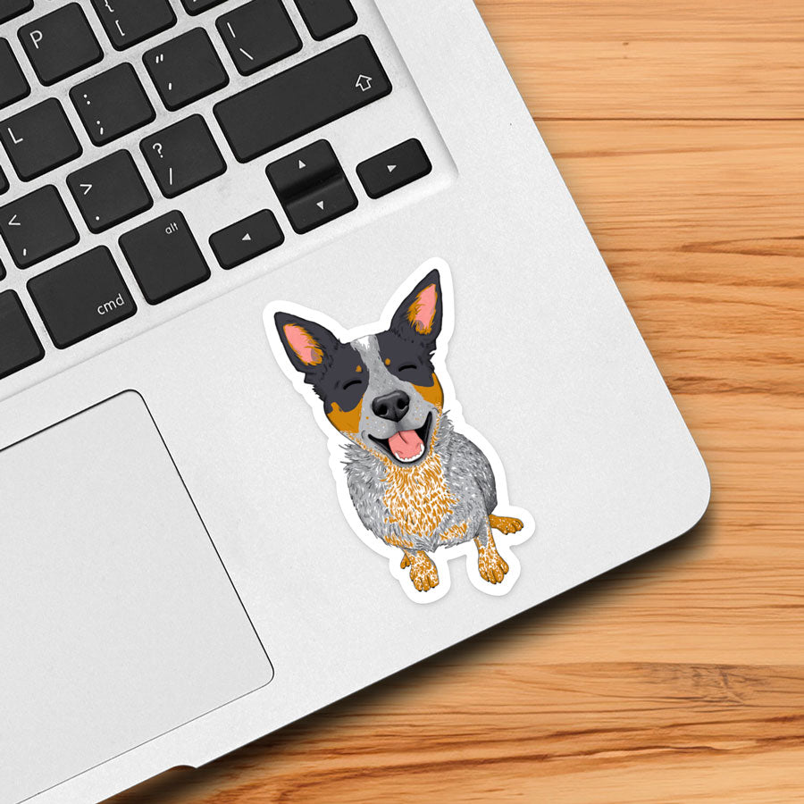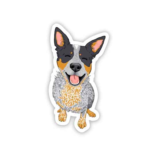 Add a playful touch to your belongings with this cattle dog-themed sticker featuring a happy and smiley blue heeler. Thick, durable vinyl protects your stickers from scratches, water, and sunlight.