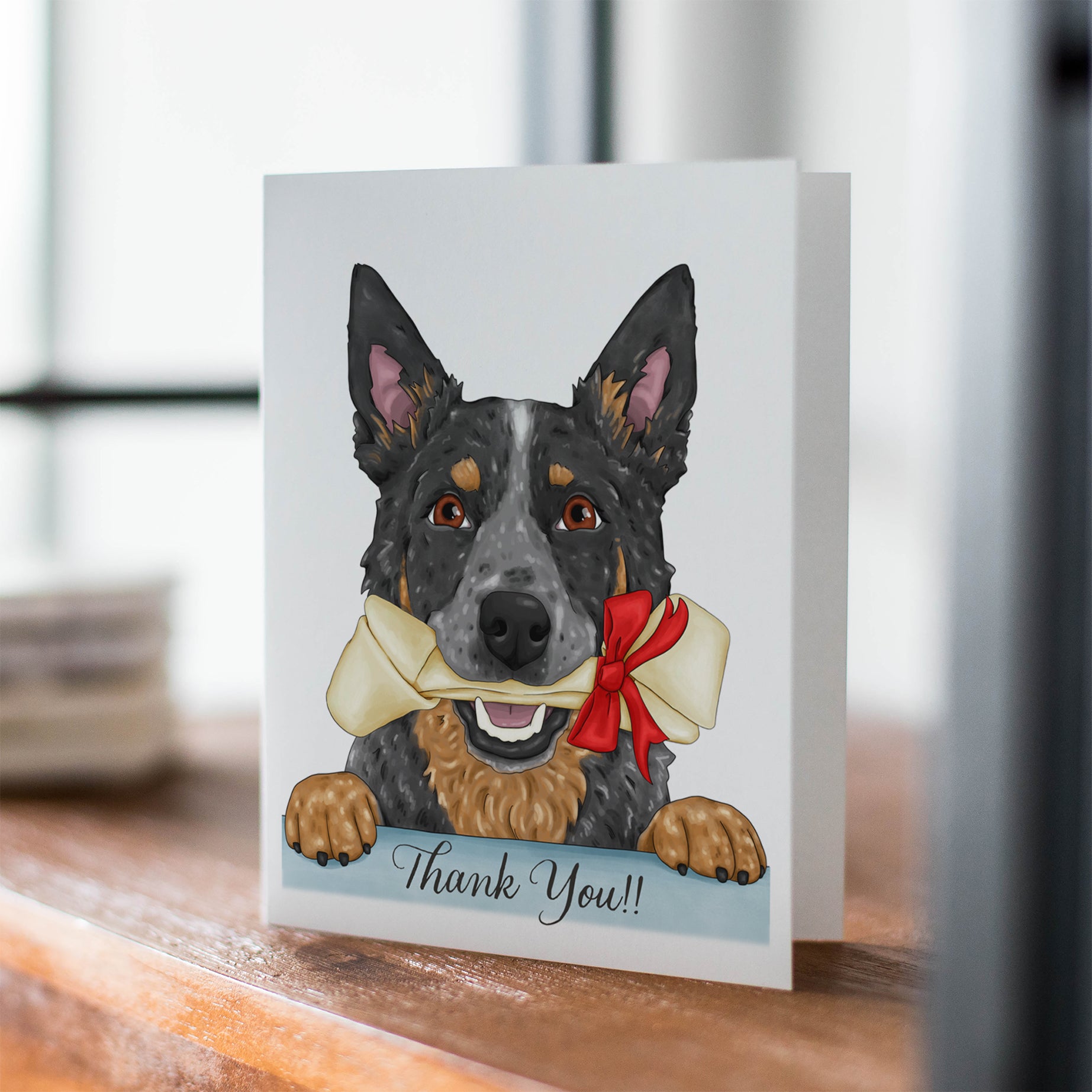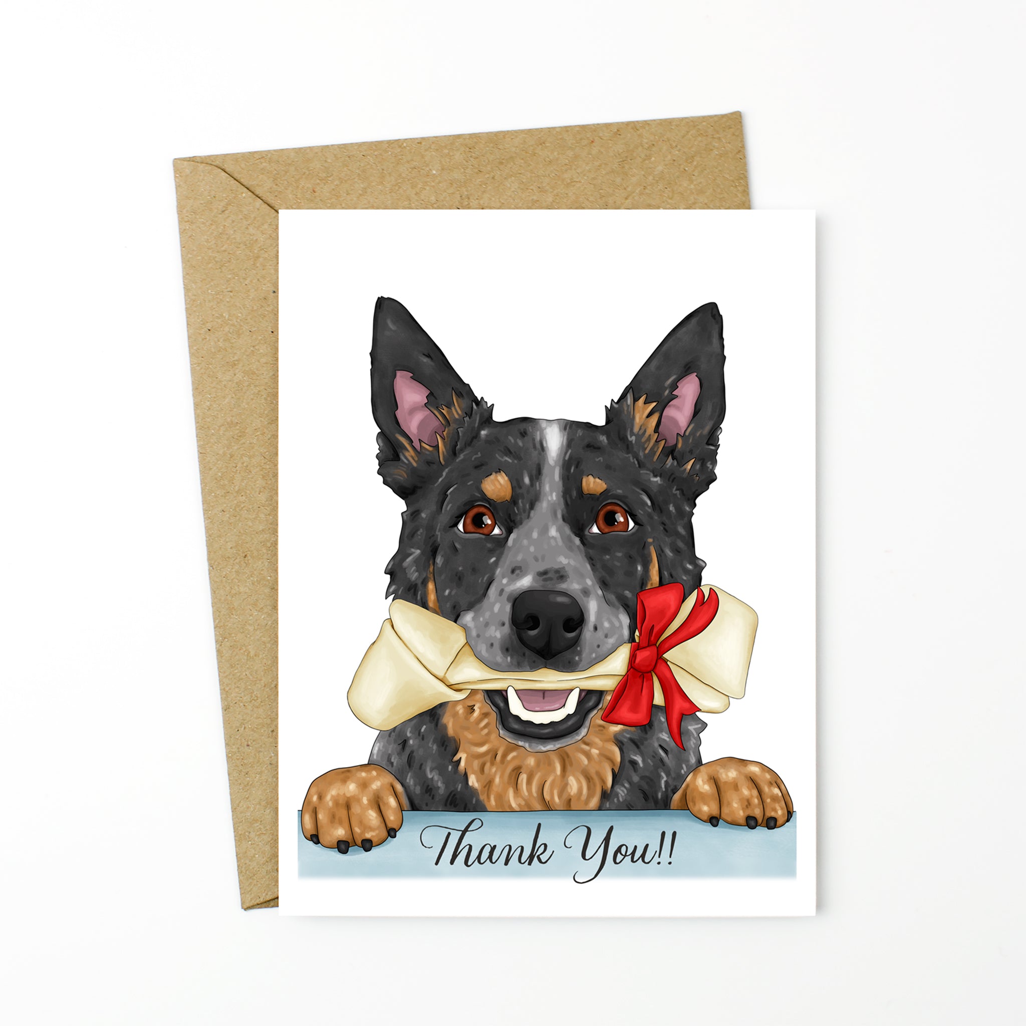 Say "Thank You" with a handsome blue heeler cattle dog gifting the perfect bone wrapped in a pretty red bow. This card is the perfect choice for dog moms, dads, walkers, veterinarians, or any dog over.
