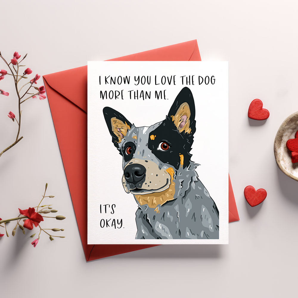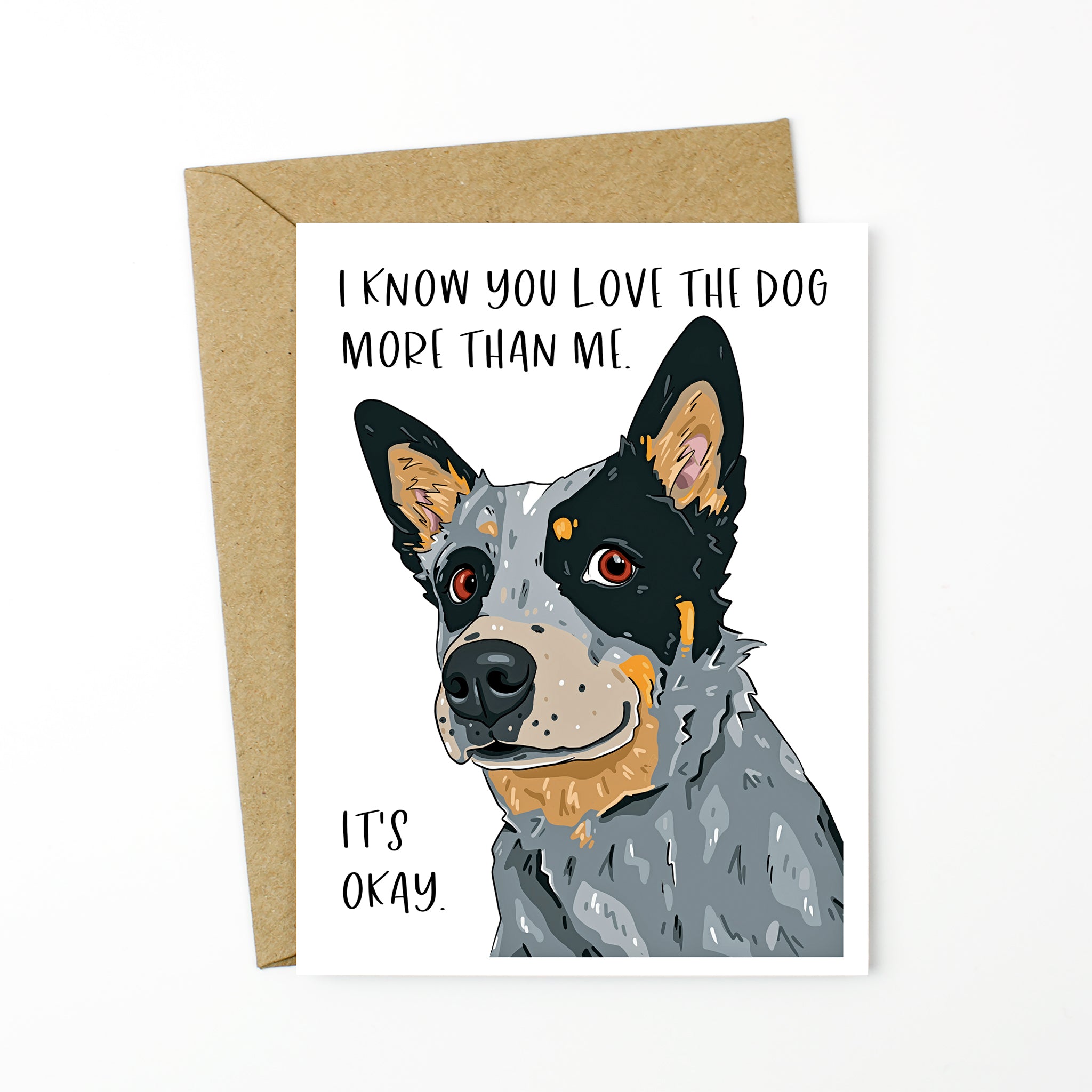 The funny blue heeler cattle dog card to give to that person in your life that you know your dog loves more. This is the perfect greeting card to express to someone how much you love them anytime that you want to send a note to a special someone and make them smile.