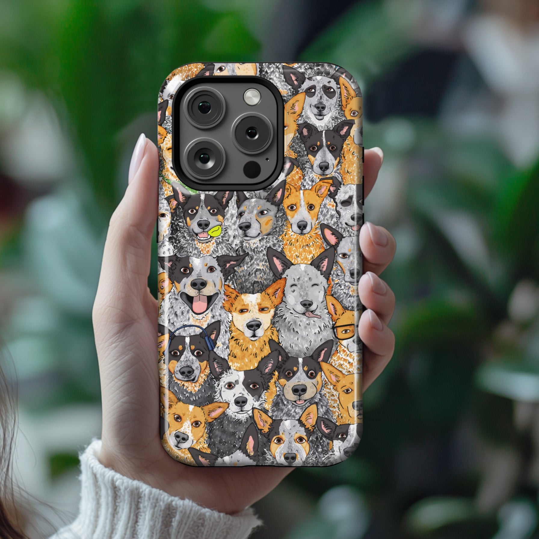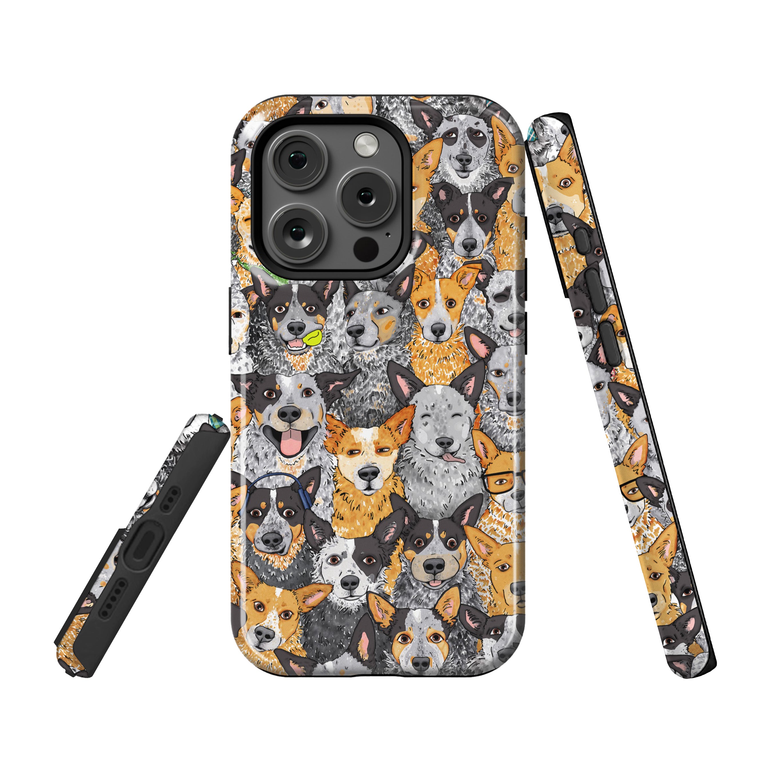 A fun cattle dog all-over-print of adorable blue and red heelers faces appear on this unique phone case for iPhones.