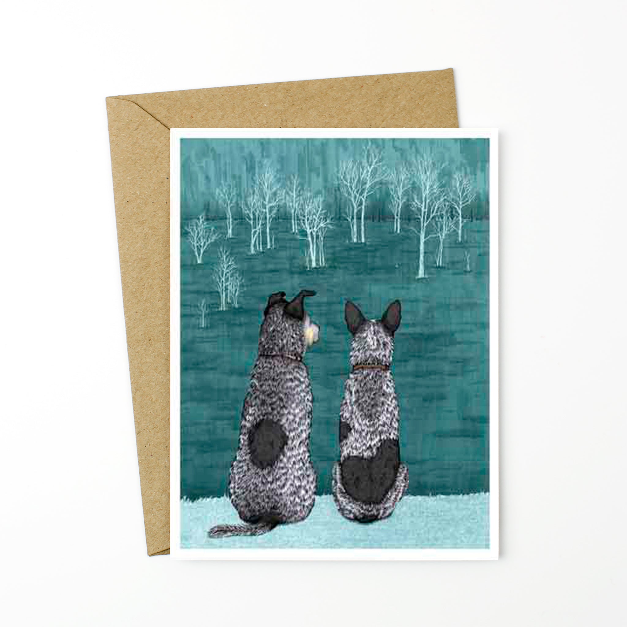 A pair of Australian cattle dogs on the lookout over a misty blue-green forest, evoking thoughts of friendship, loyalty, and love.