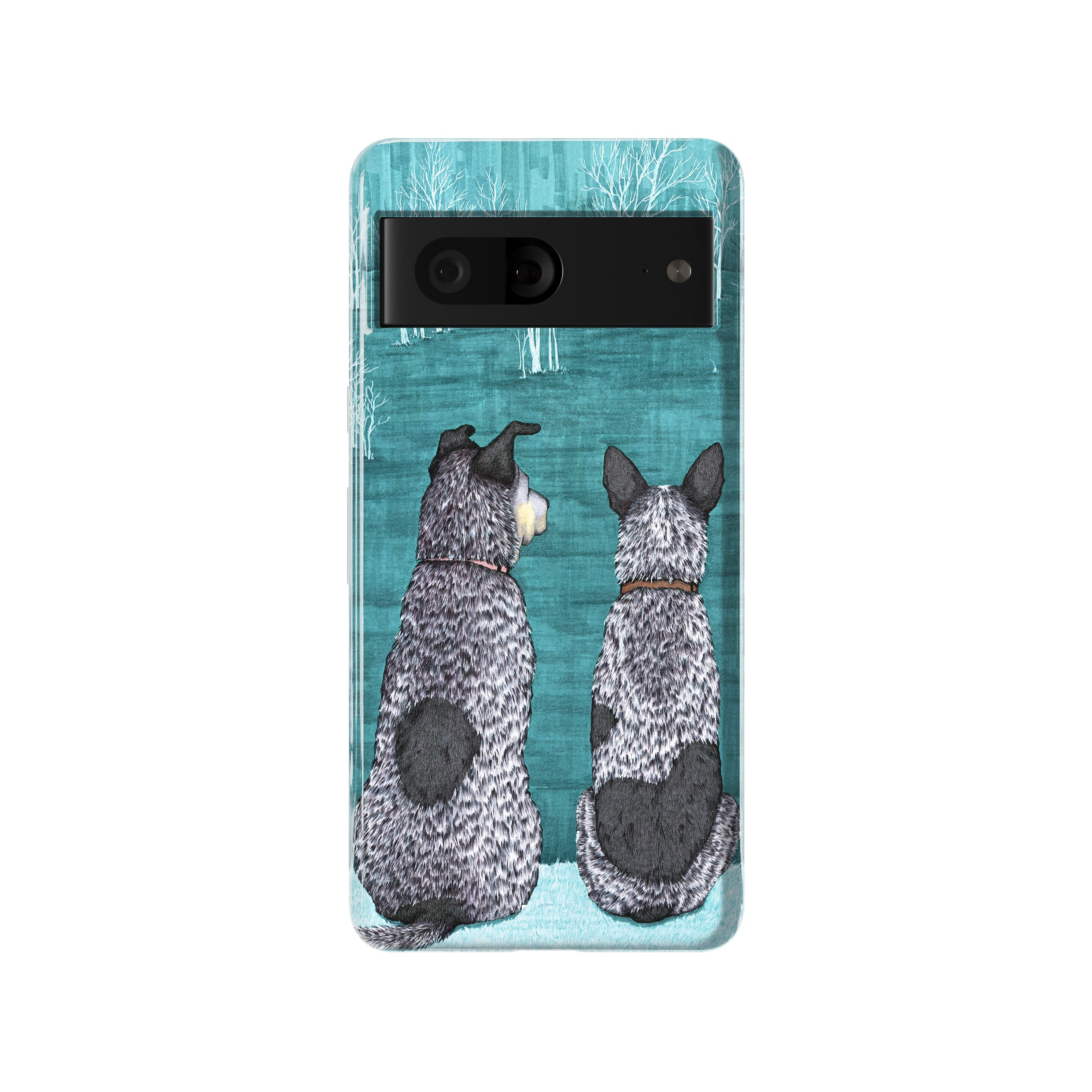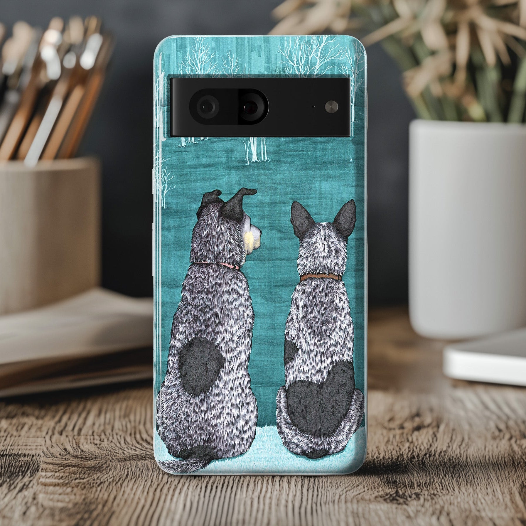 A pair of Australian Cattle Dogs on the lookout over a misty blue-green forest, evoking a thought of friendship, loyalty, and love.