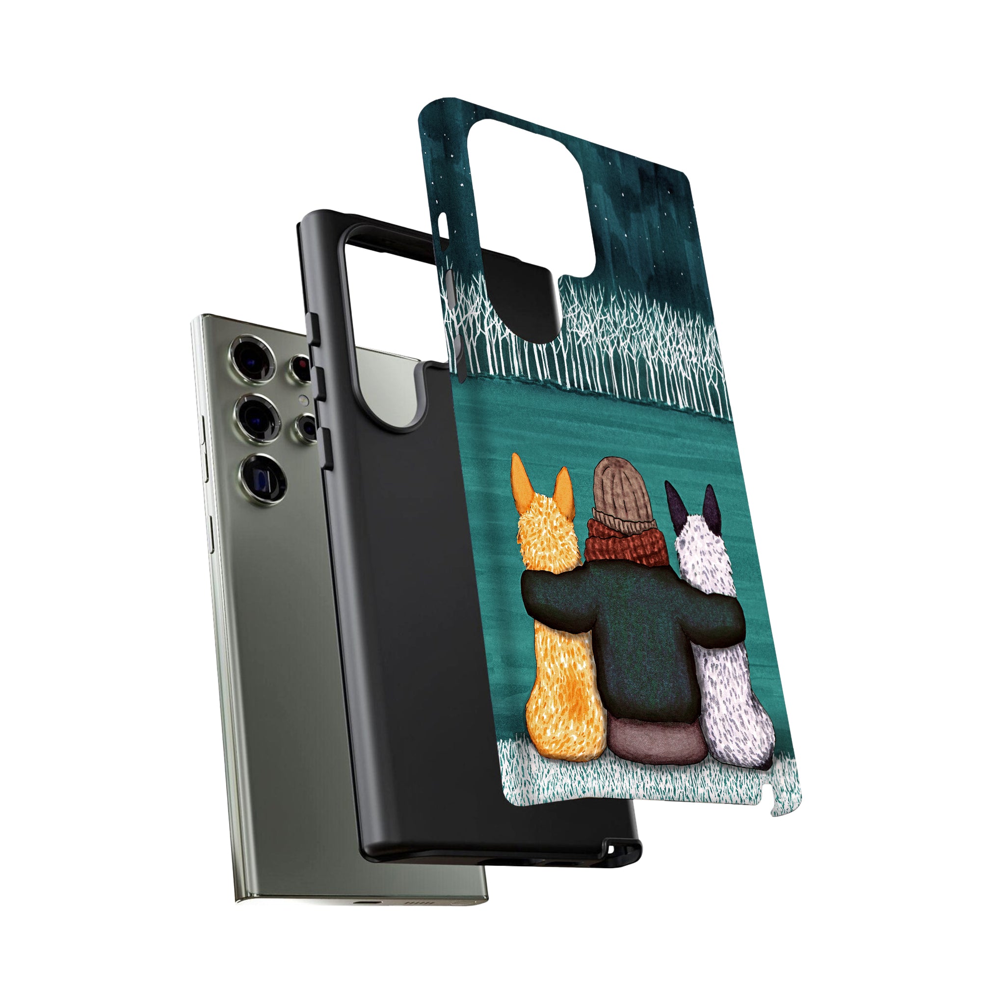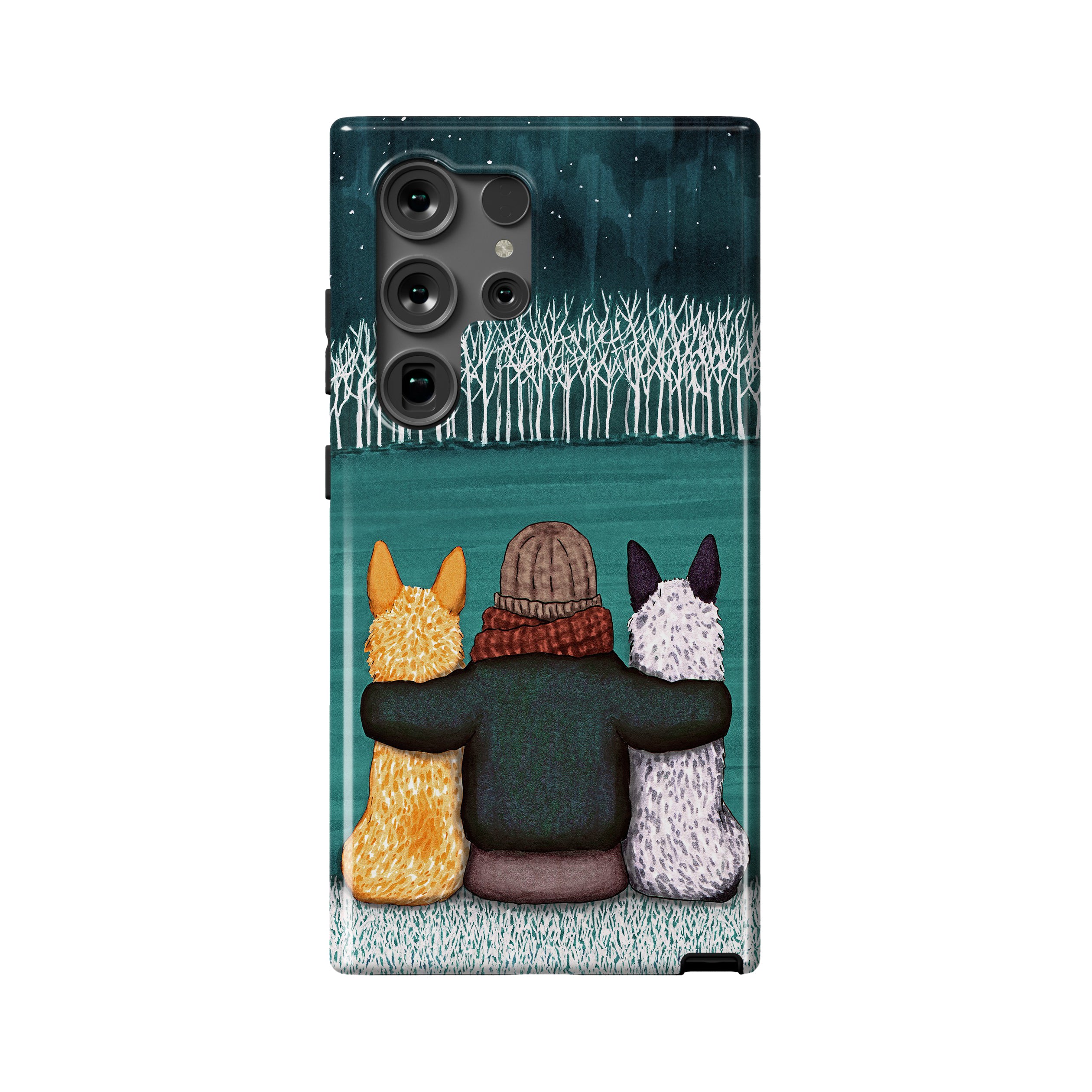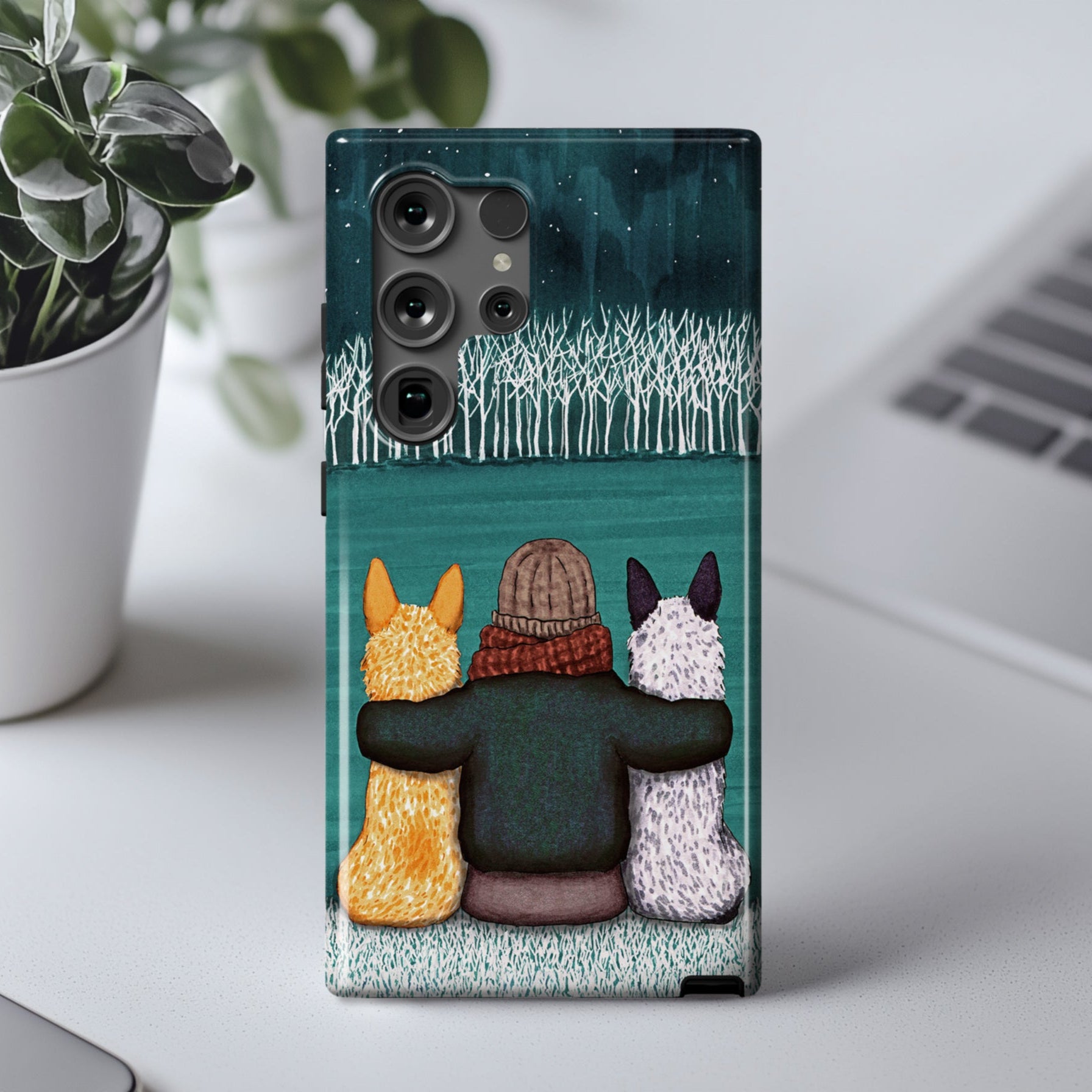 A blue heeler and a red heeler sit on an overlook with their best human.