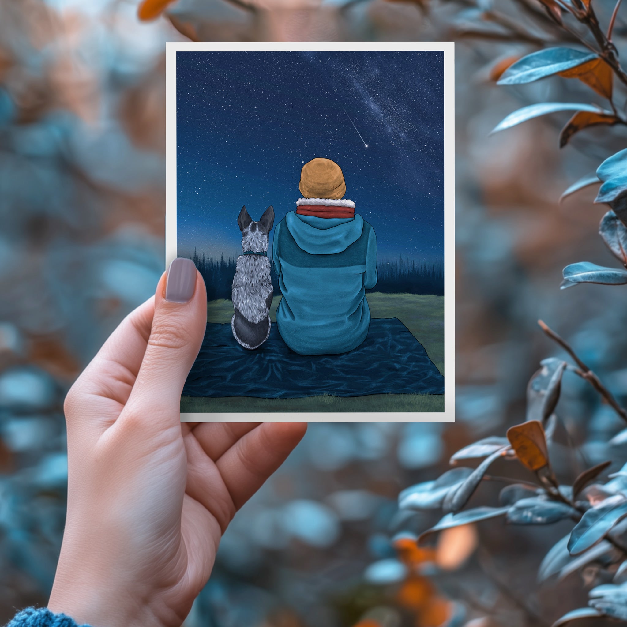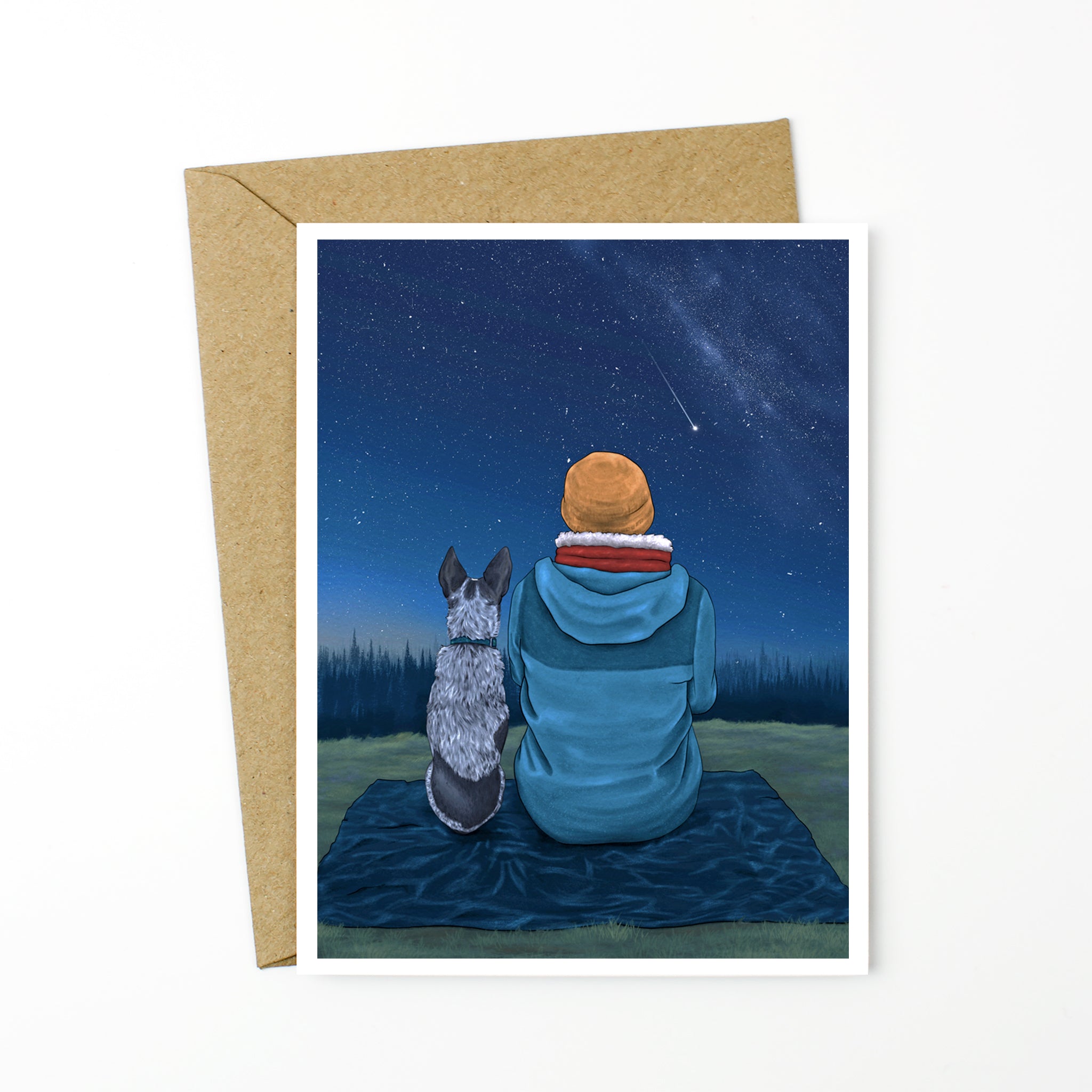 A cozy stargazing moment with a cattle dog pup and their human in this special greeting card