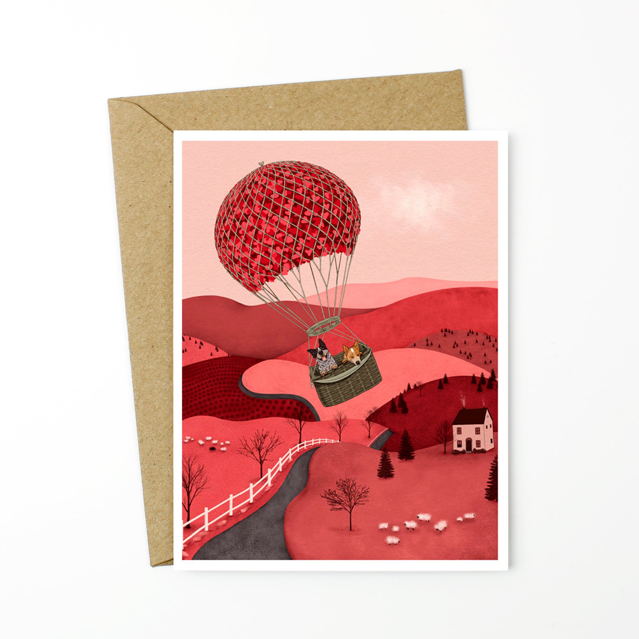 This beautifully illustrated greeting card features a blue heeler and red heeler cattle dog as they soar high above the countryside in a hot air balloon filled with hearts. This makes the perfect greeting card gift for any occasion and is sure to make someone feel special.