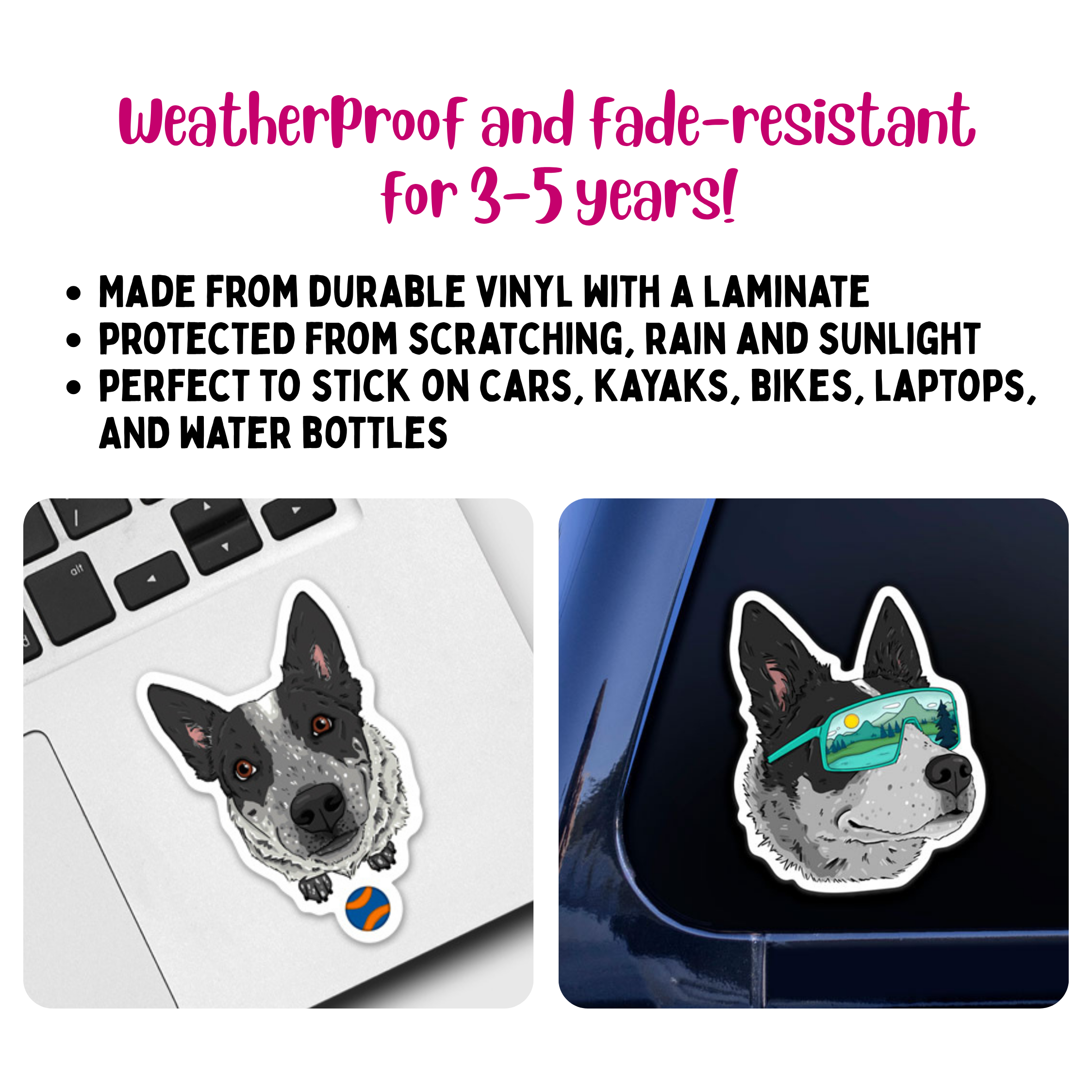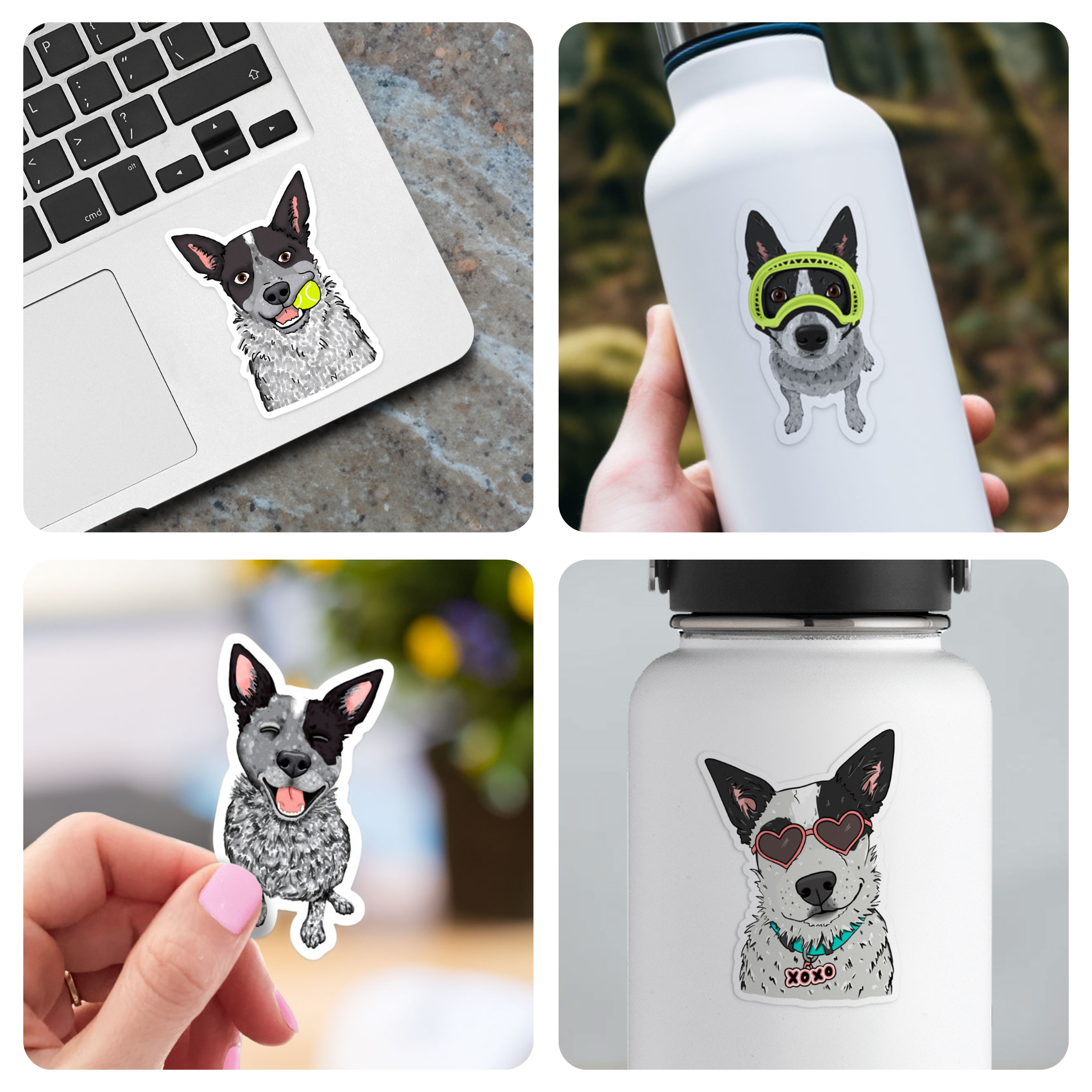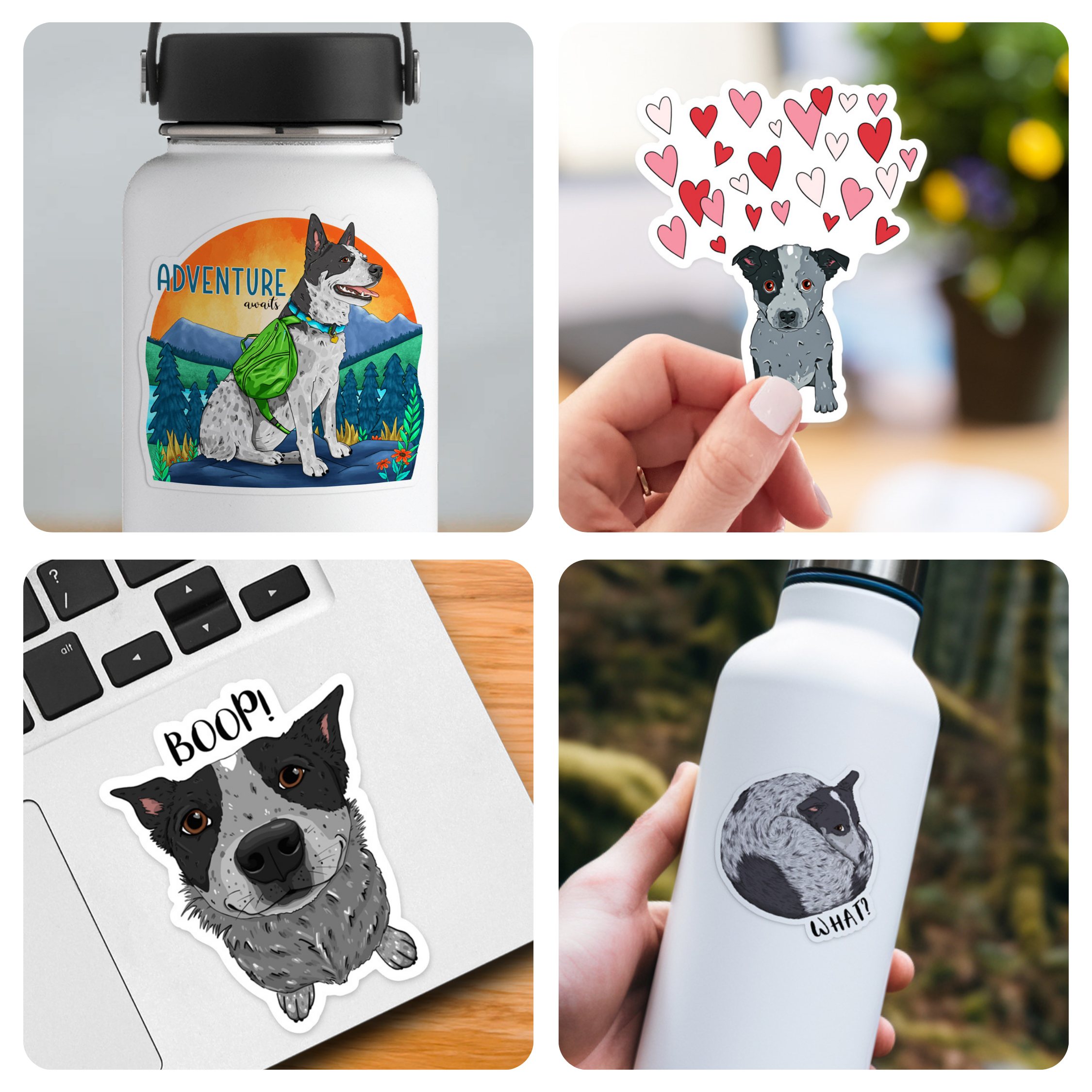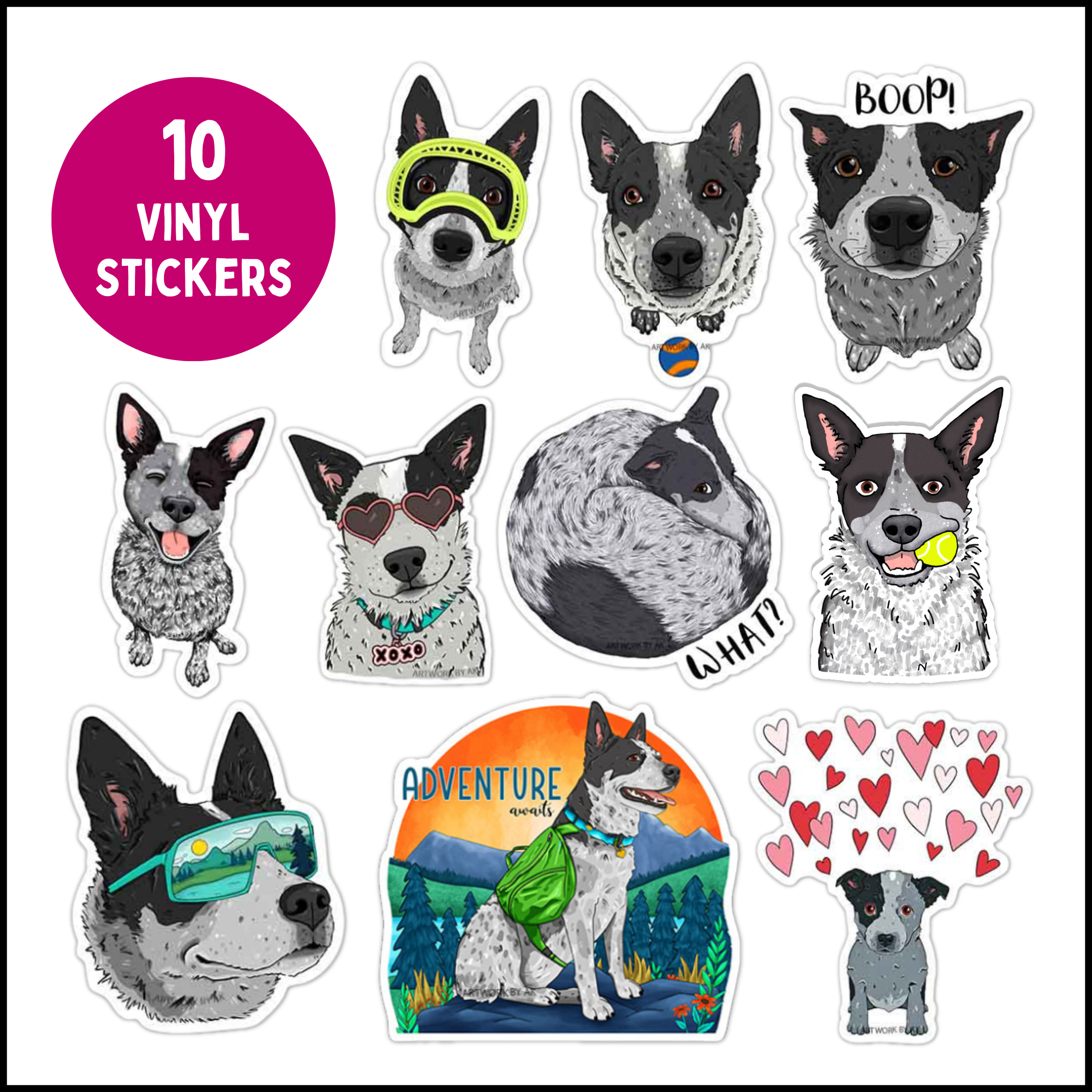 Save on the cutest set of 10 cattle dog stickers. These make the perfect decals to stick on cars, kayaks, bikes, laptops, water bottles, etc.