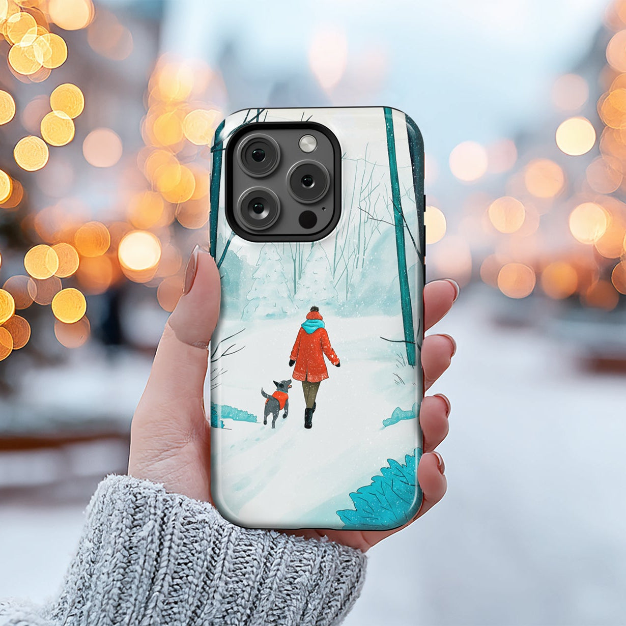 A cattle dog looks up happily at their human while on a walk in winter with the snow falling.