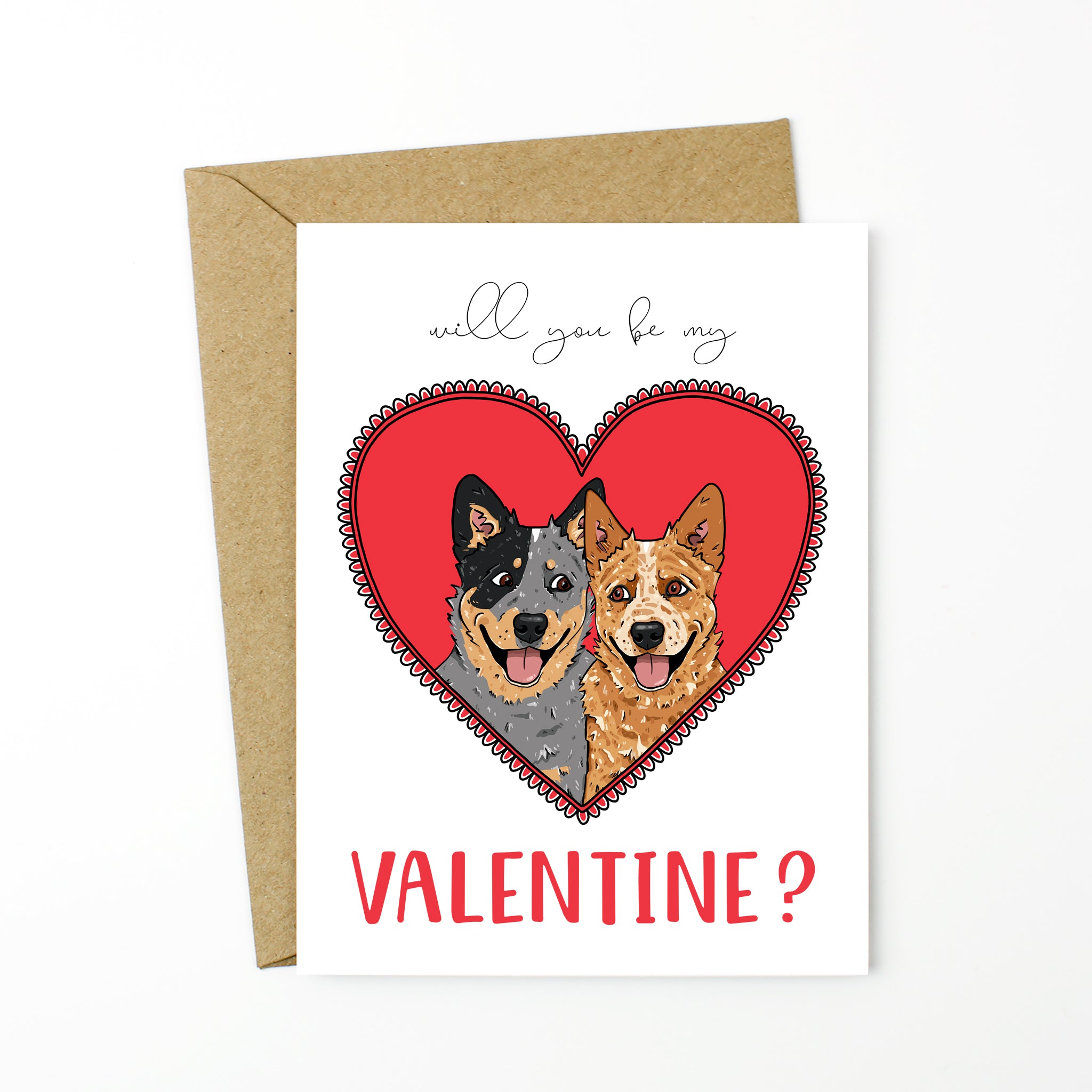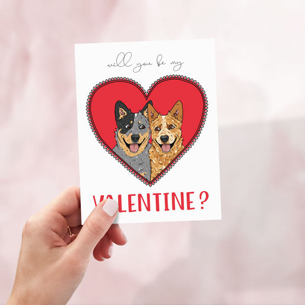 An adorable blue heeler and red heeler cattle dog pair cozy up together and ask if you will be their valentine this year.