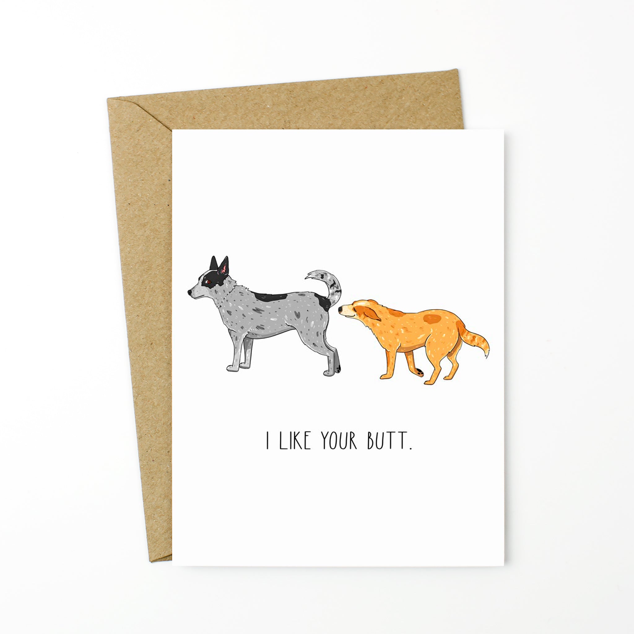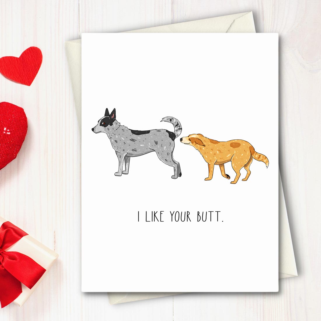Make someone laugh with this hilarious cattle dog card that features a blue and red heeler and the words "I Like Your Butt."