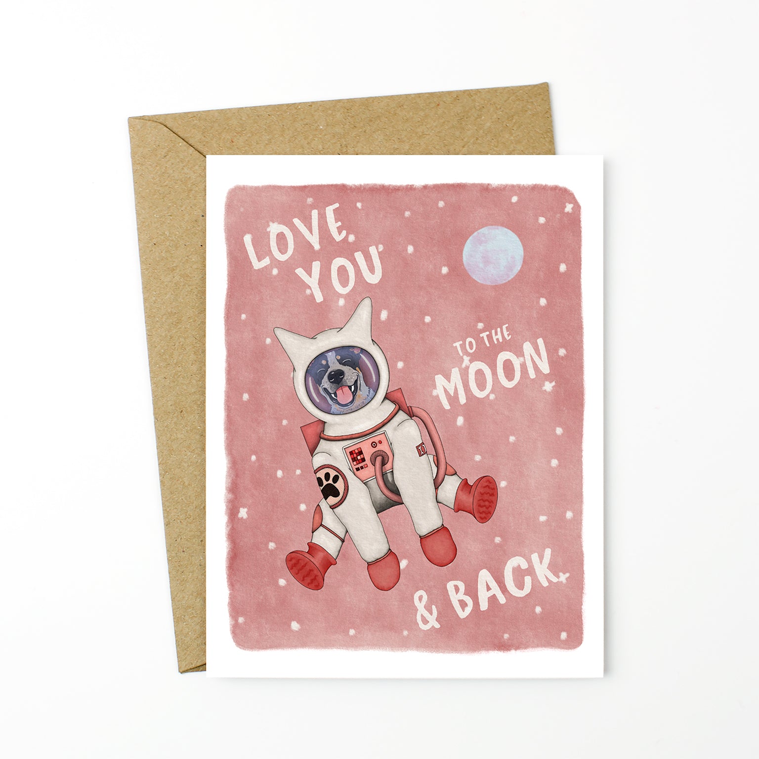 Celebrate puppy love with this adorable Blue Heeler Valentine’s Day card featuring a space suit and moonlit sky.