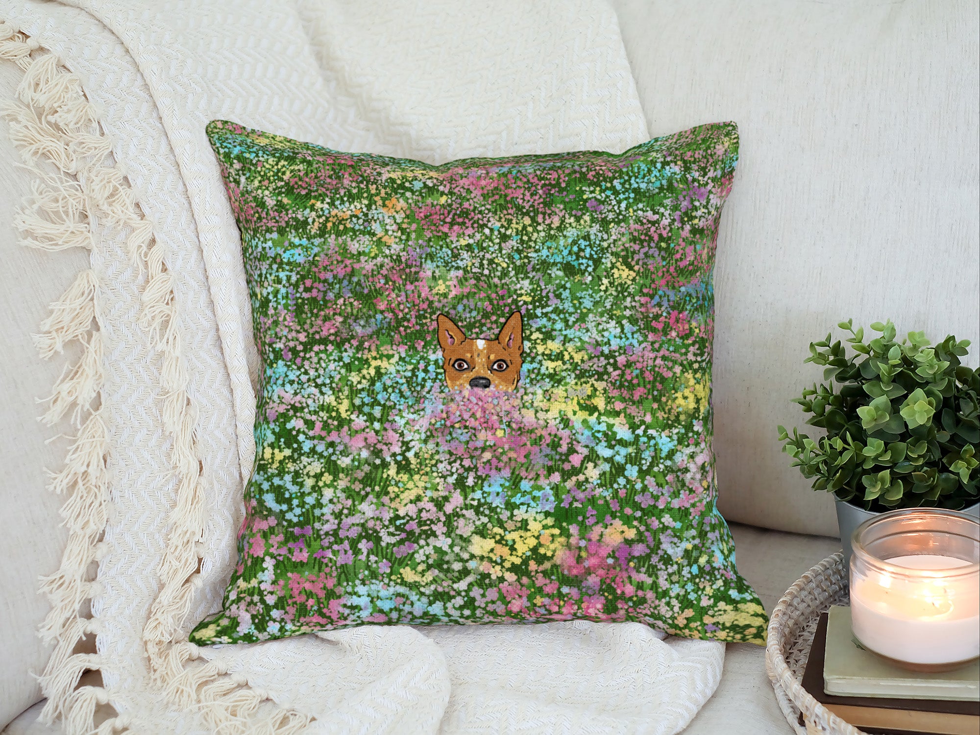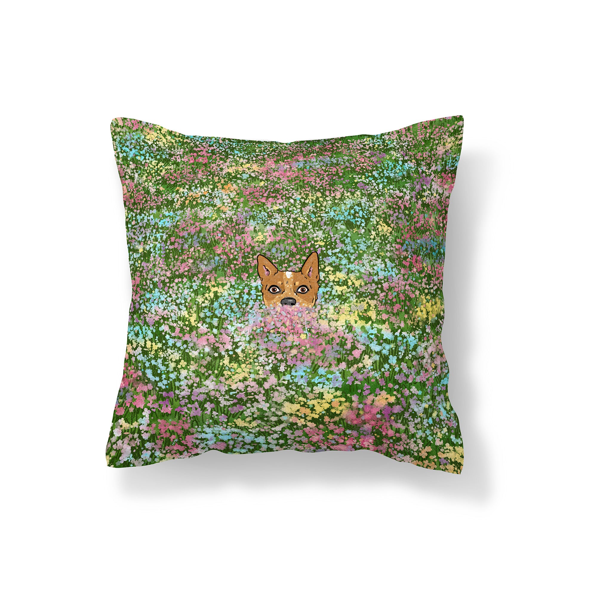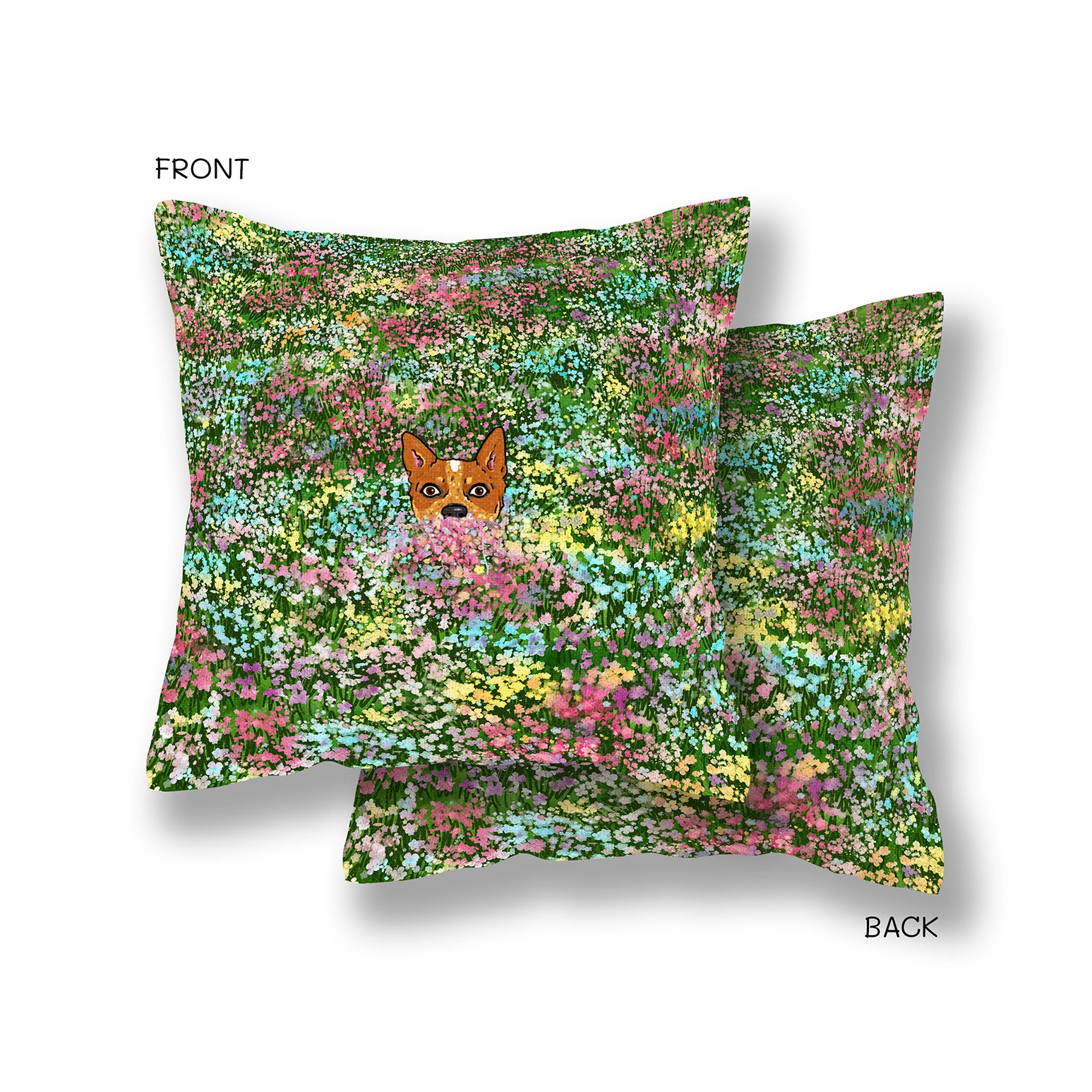 A cute red heeler cattle dog puppy peeping out of a field of colorful flowers. This premium textured pillow cover will add a splash of Spring color and a dose of cattle dog love to your home.