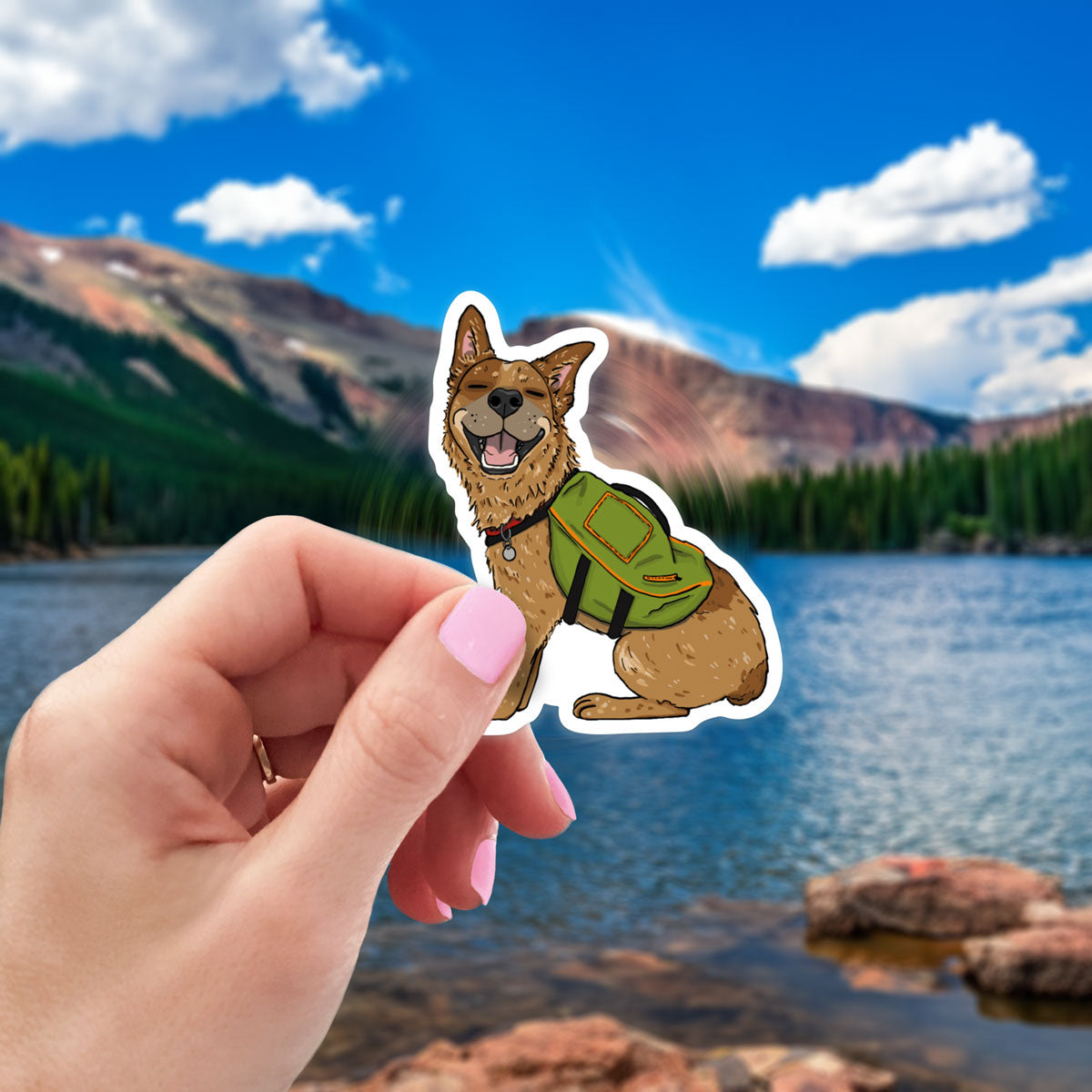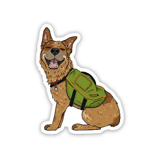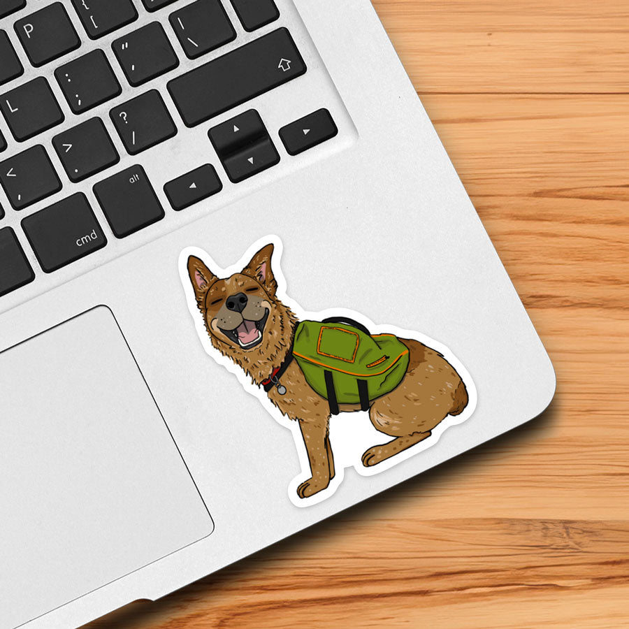 A happy red heeler puppy has their backpack on and is ready for adventure! Thick, durable vinyl protects your stickers from scratches, water, and sunlight.