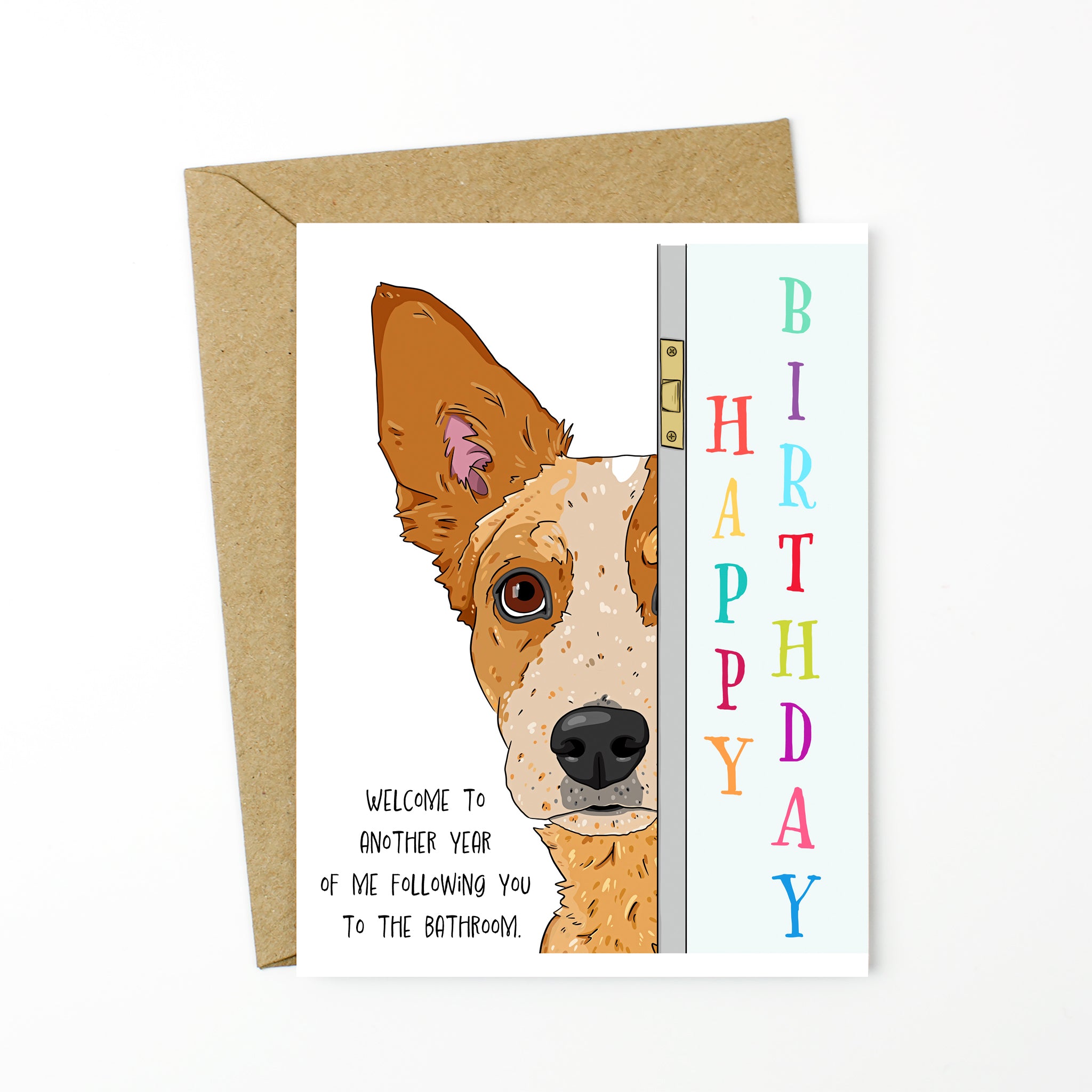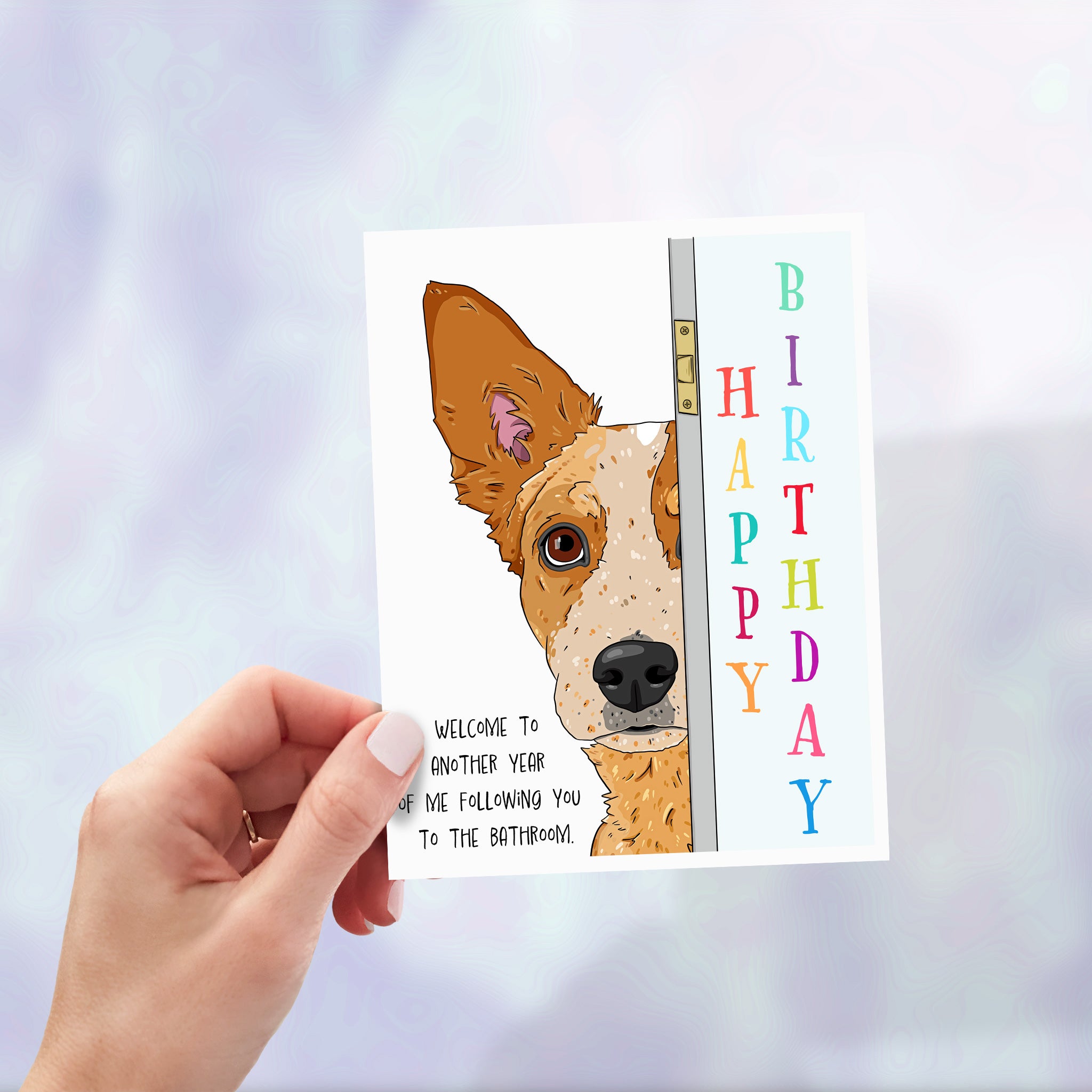 A red heeler dog is featured in this funny happy birthday card that let's the recipient know that for another year they'll be following you to the bathroom. This is the perfect birthday card for the dog love in your life and is sure to get a few chuckles.