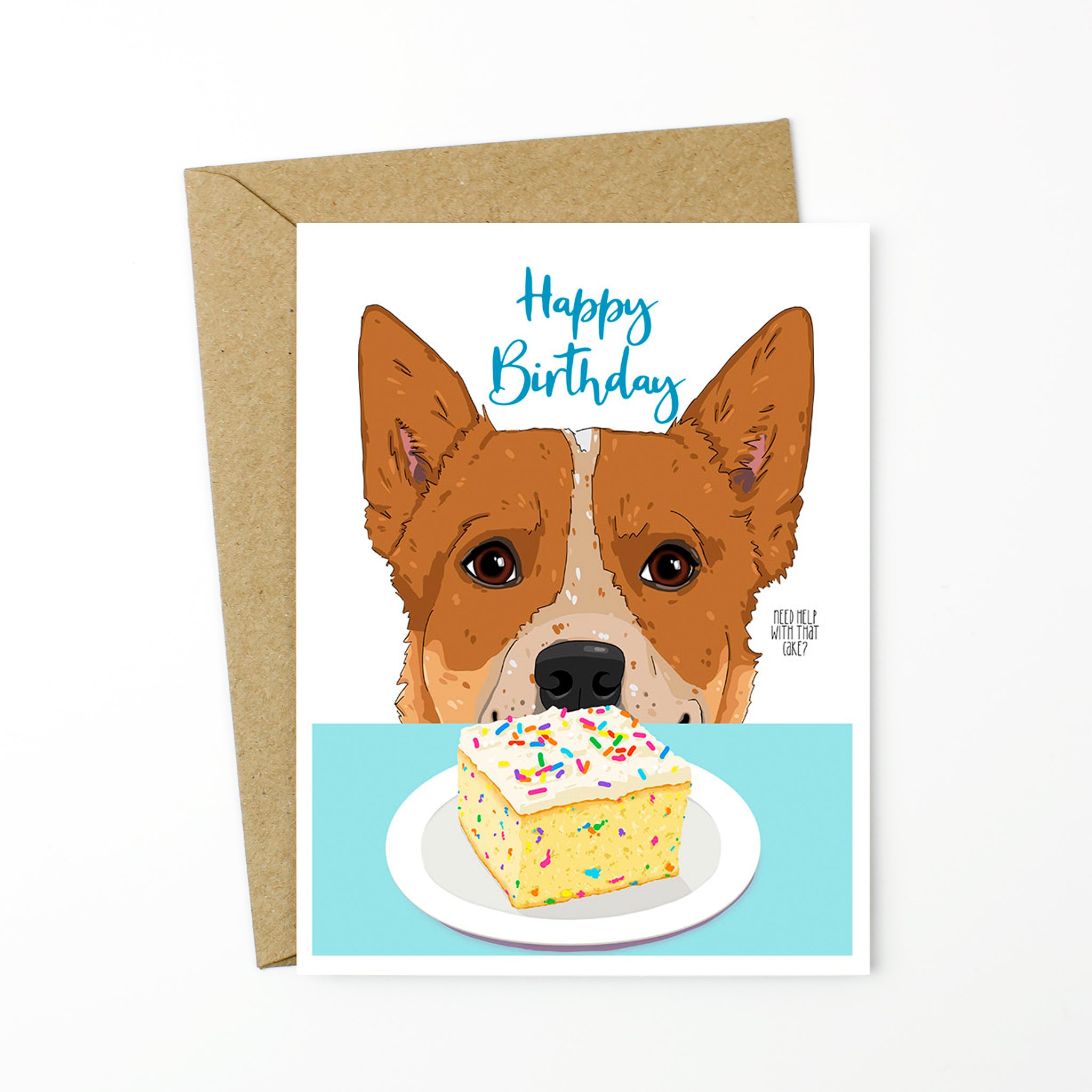 A red heeler cattle dog is ready to help with a slice of cake if needed... they're super helpful that way! This birthday card is perfect for the dog mom or dad in your life