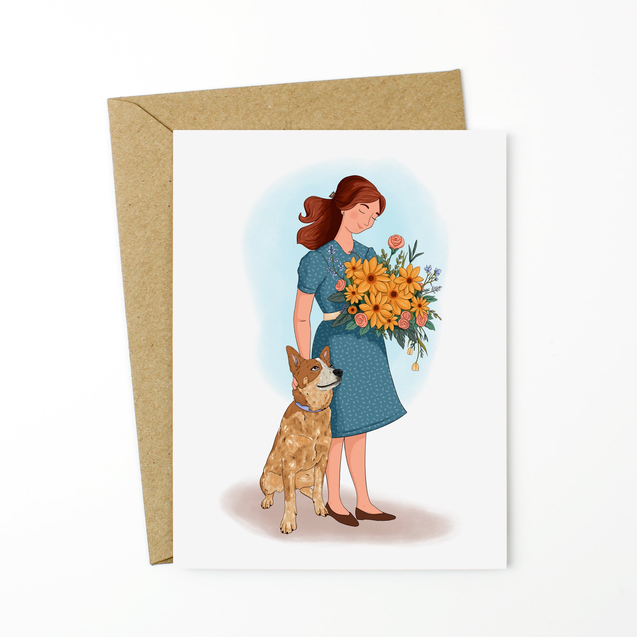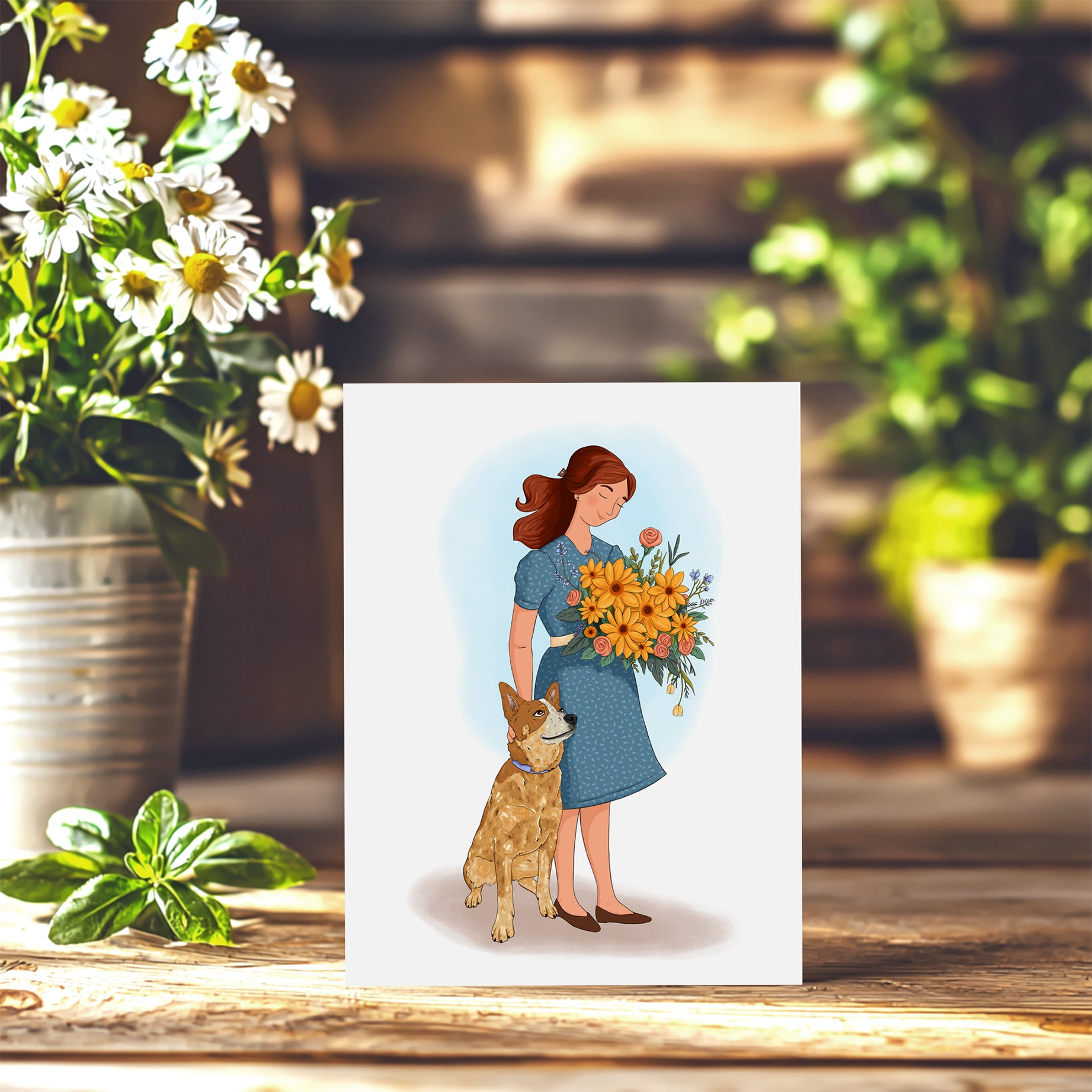 The card features a tender illustration of a loving Cattle Dog Mom in a blue dress, holding a beautiful bouquet of flowers, with her loyal Red Heeler gazing up at her with affection.
