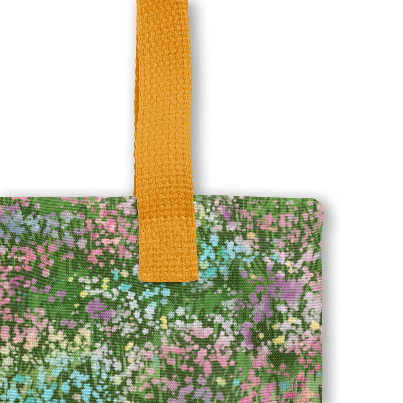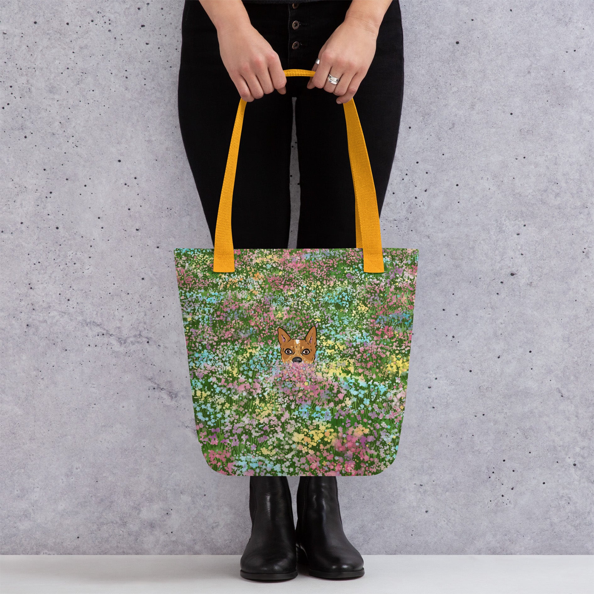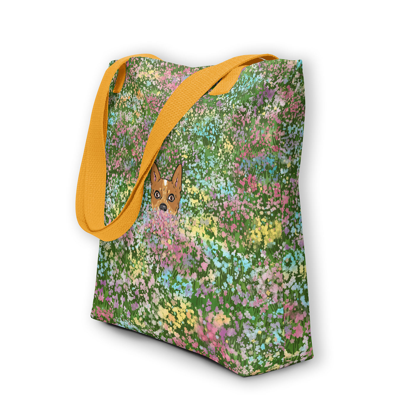 Artwork featuring a red heeler peeking out from a field of colorful flowers. This tote bag is compact but has enough room for groceries or bring it to the park with all your pup's treats and toys.