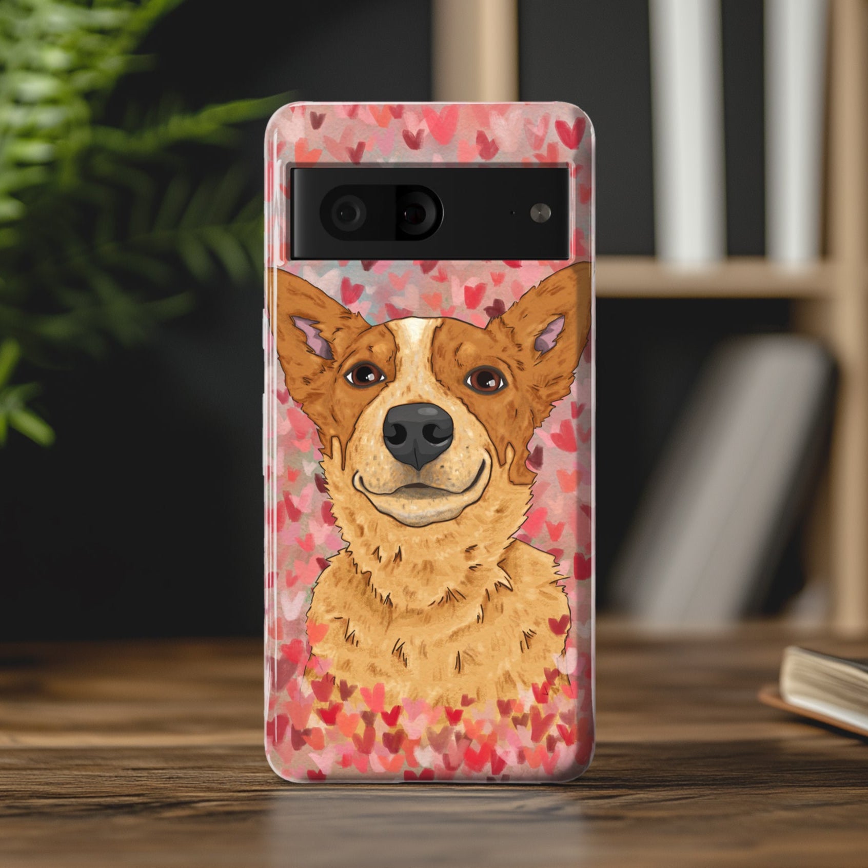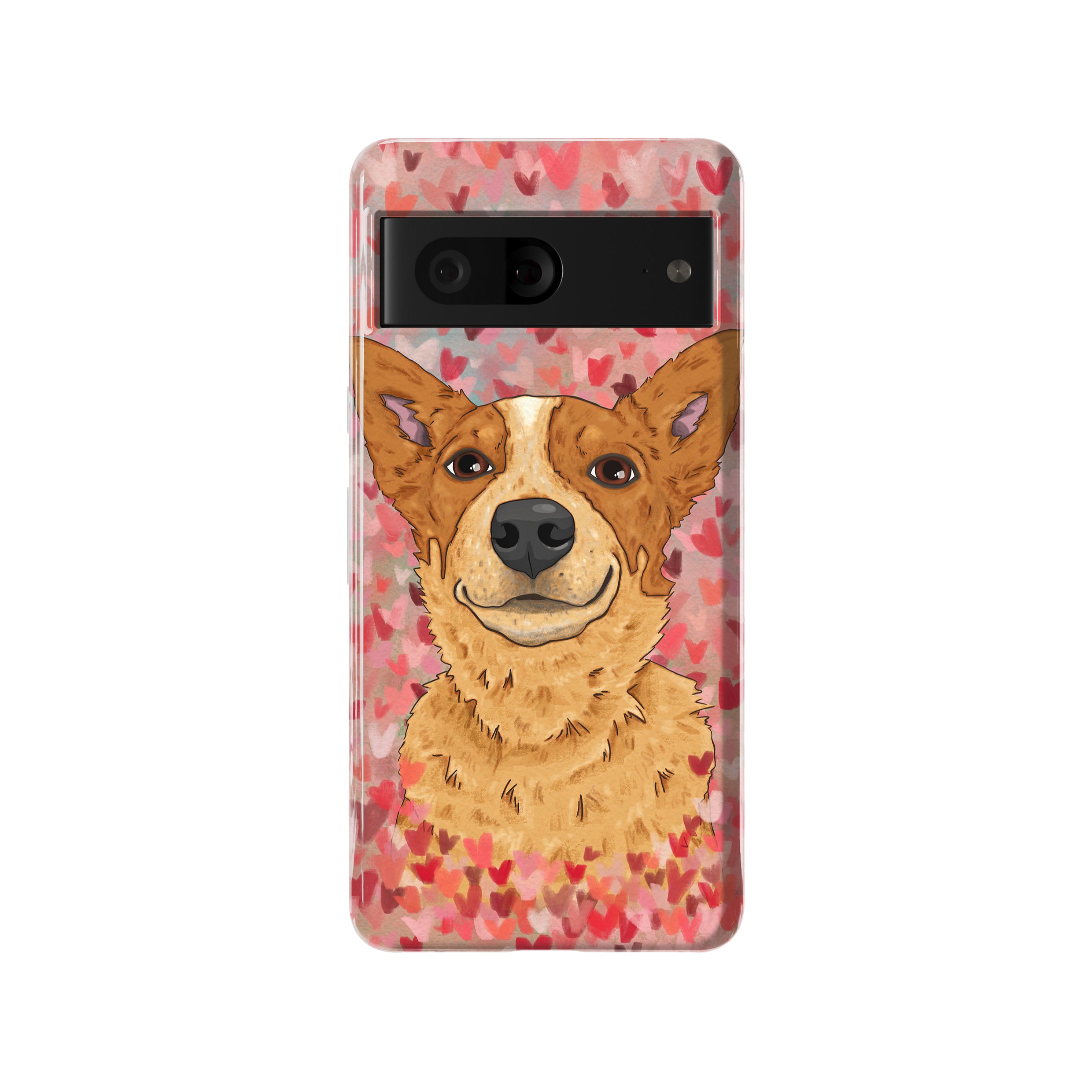 A happy red heeler cattle dog surrounded by colorful hearts.