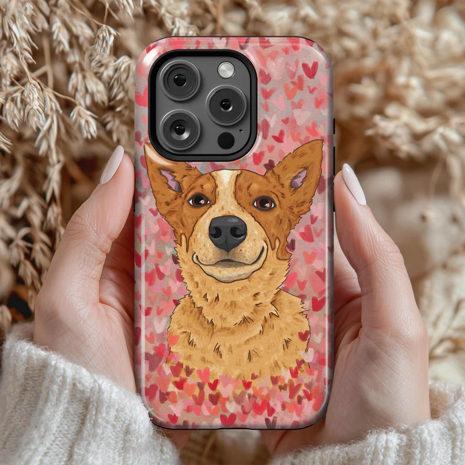 A happy red heeler cattle dog is surrounded by colorful hearts makes for a lovely iPhone case is the perfect gift for dog moms.