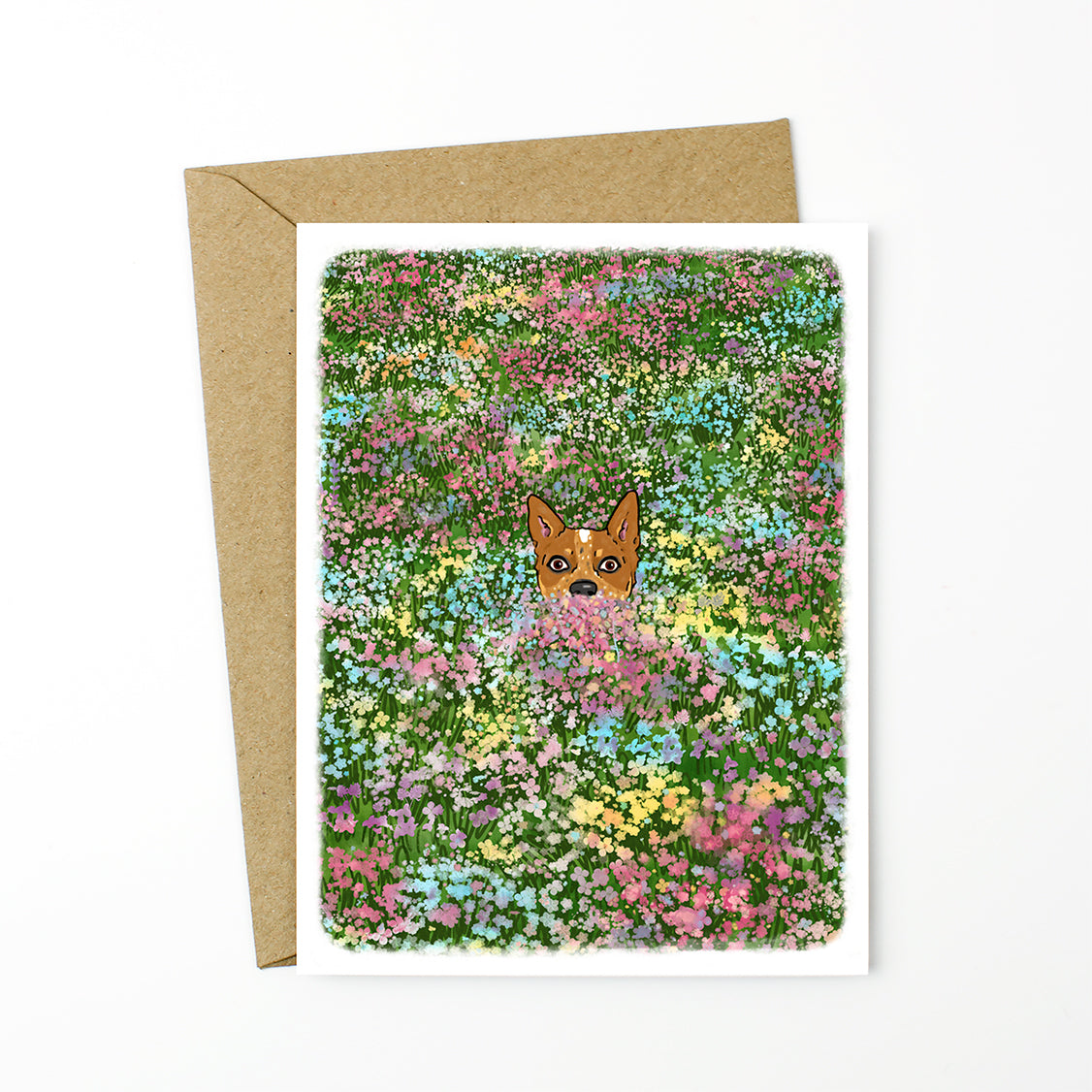 Send a cheerful spring hello with this sweet Spring-themed cattle dog greeting card featuring a red heeler pup peeking through colorful flowers. Perfect for Mother's Day, Easter, or just to bring a smile to the dog person in your life and make them feel truly appreciated!