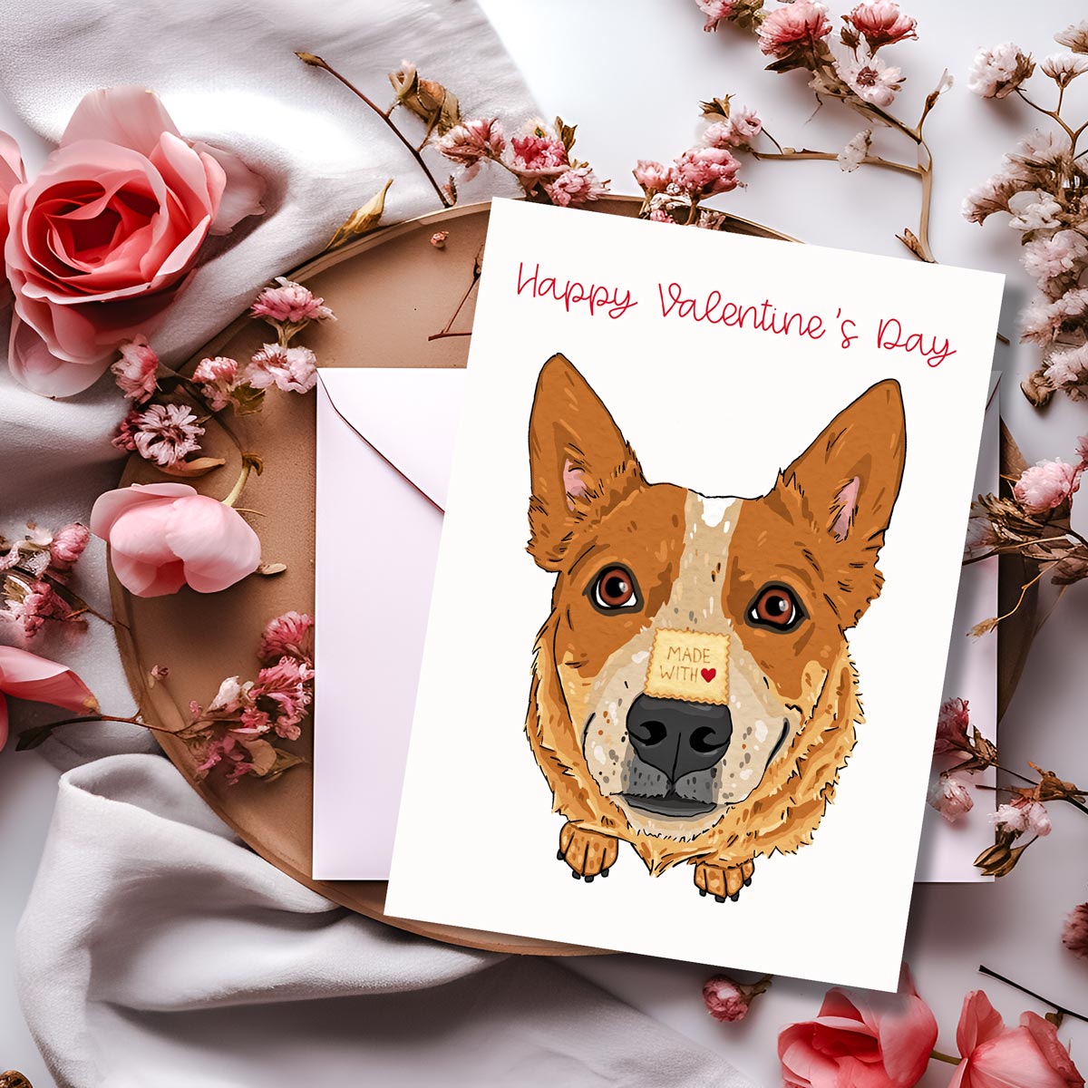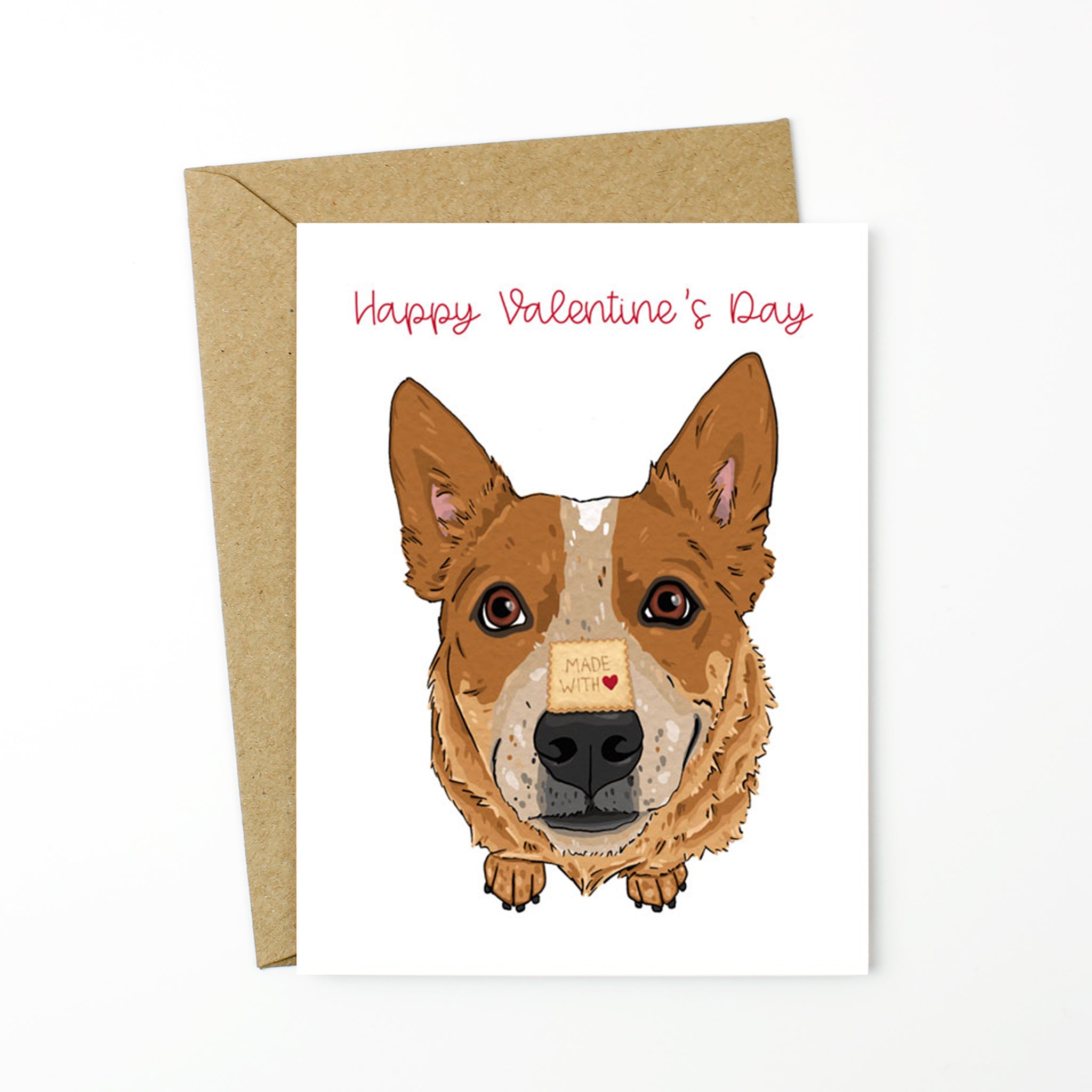 A cute red heeler cattle dog with a cookie message "Made With Love" that sits playfully on top of their nose. This makes for a sweet Valentine's Day card to send to your special human!