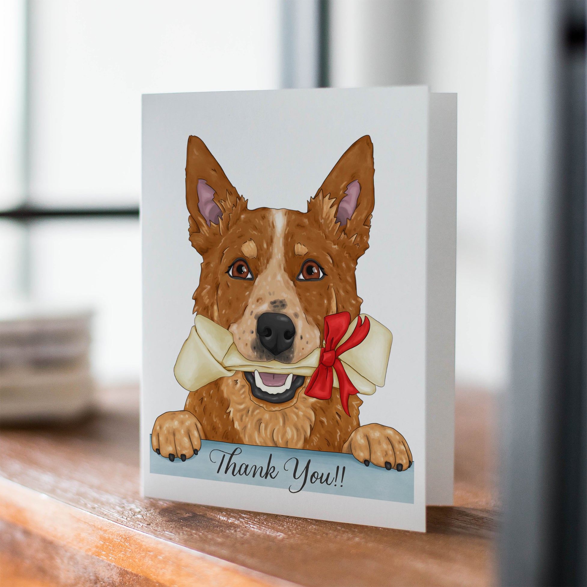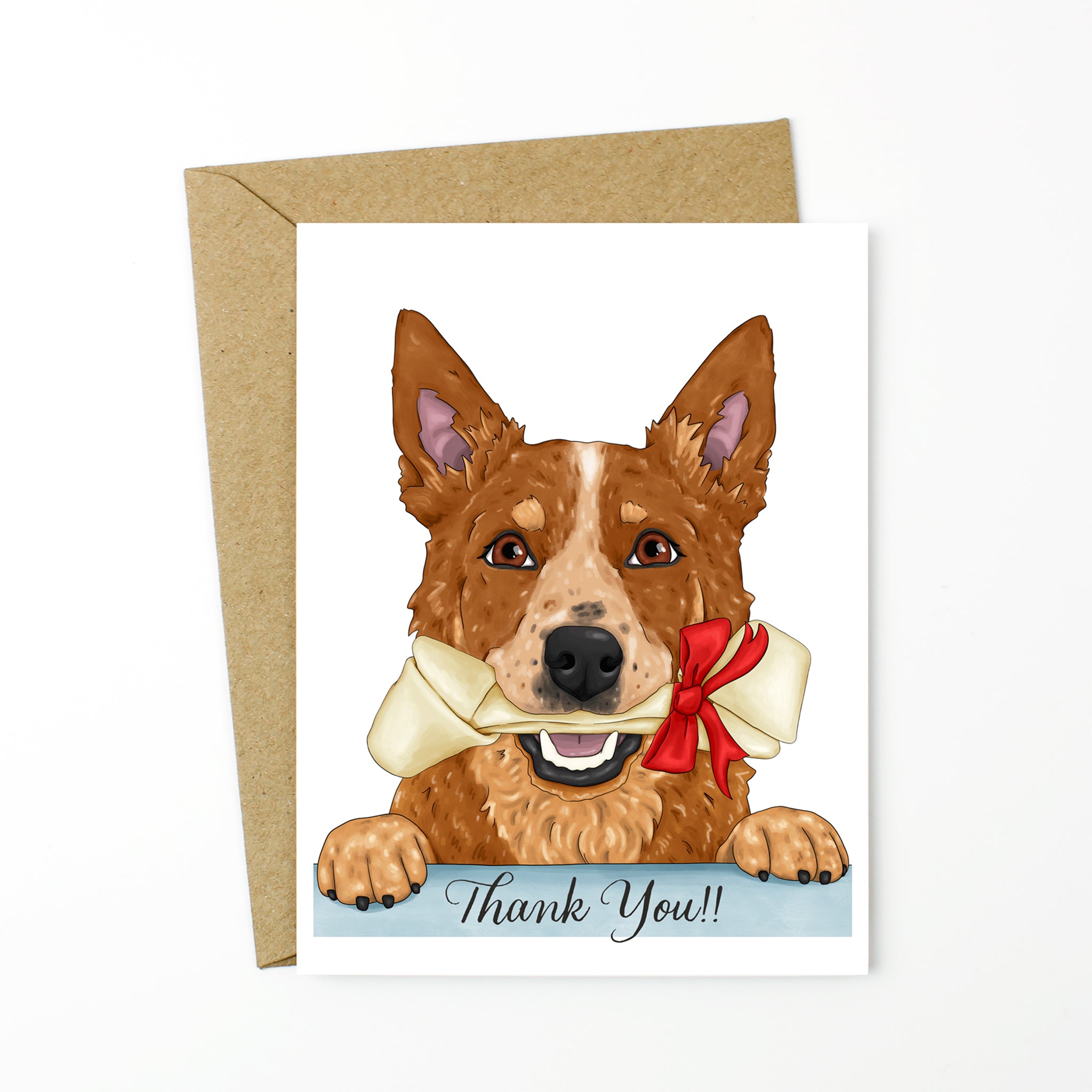 Say "Thank You" with a handsome red heeler cattle dog gifting the perfect bone wrapped in a pretty red bow. This card is the perfect choice for dog moms, dads, walkers, veterinarians, or any dog over.