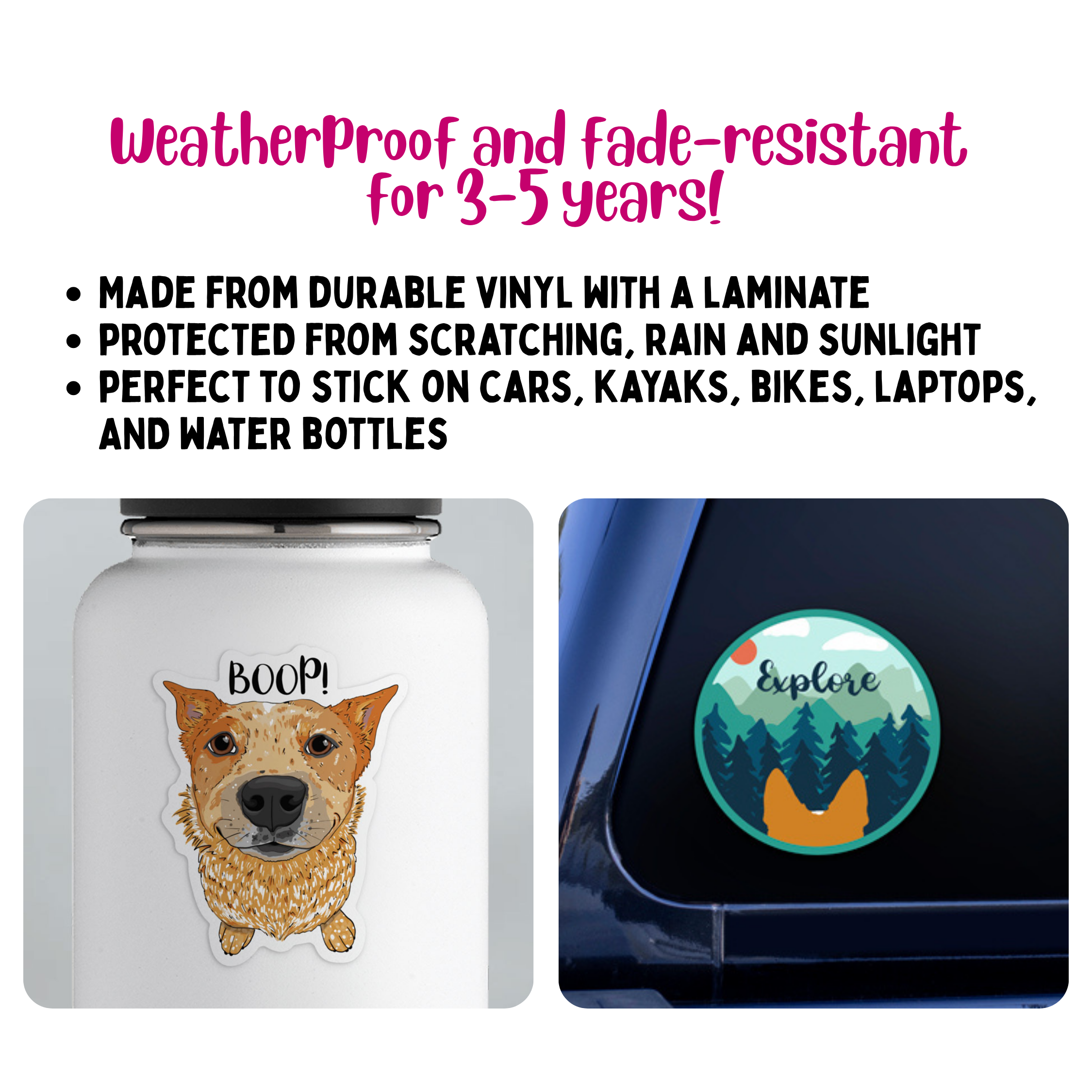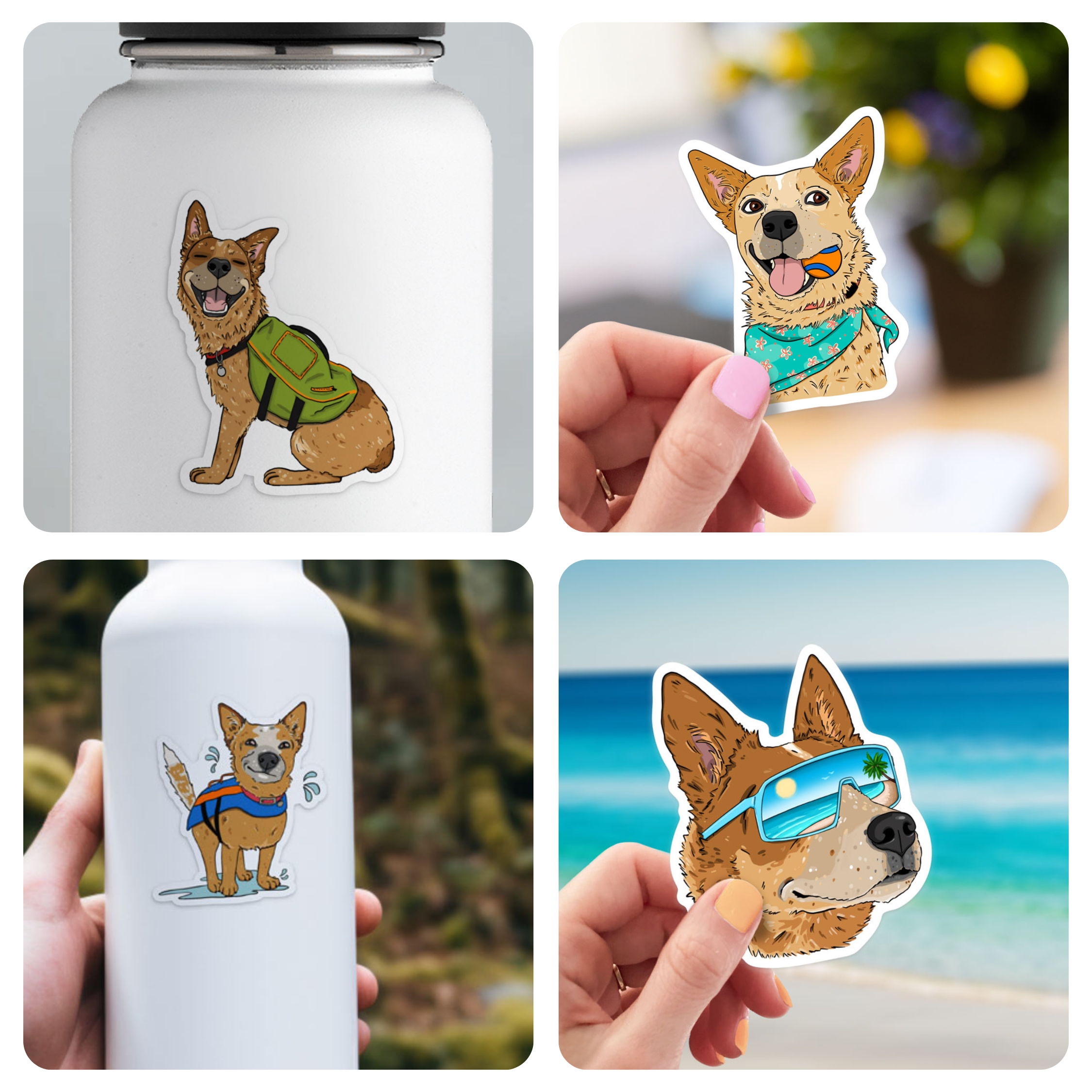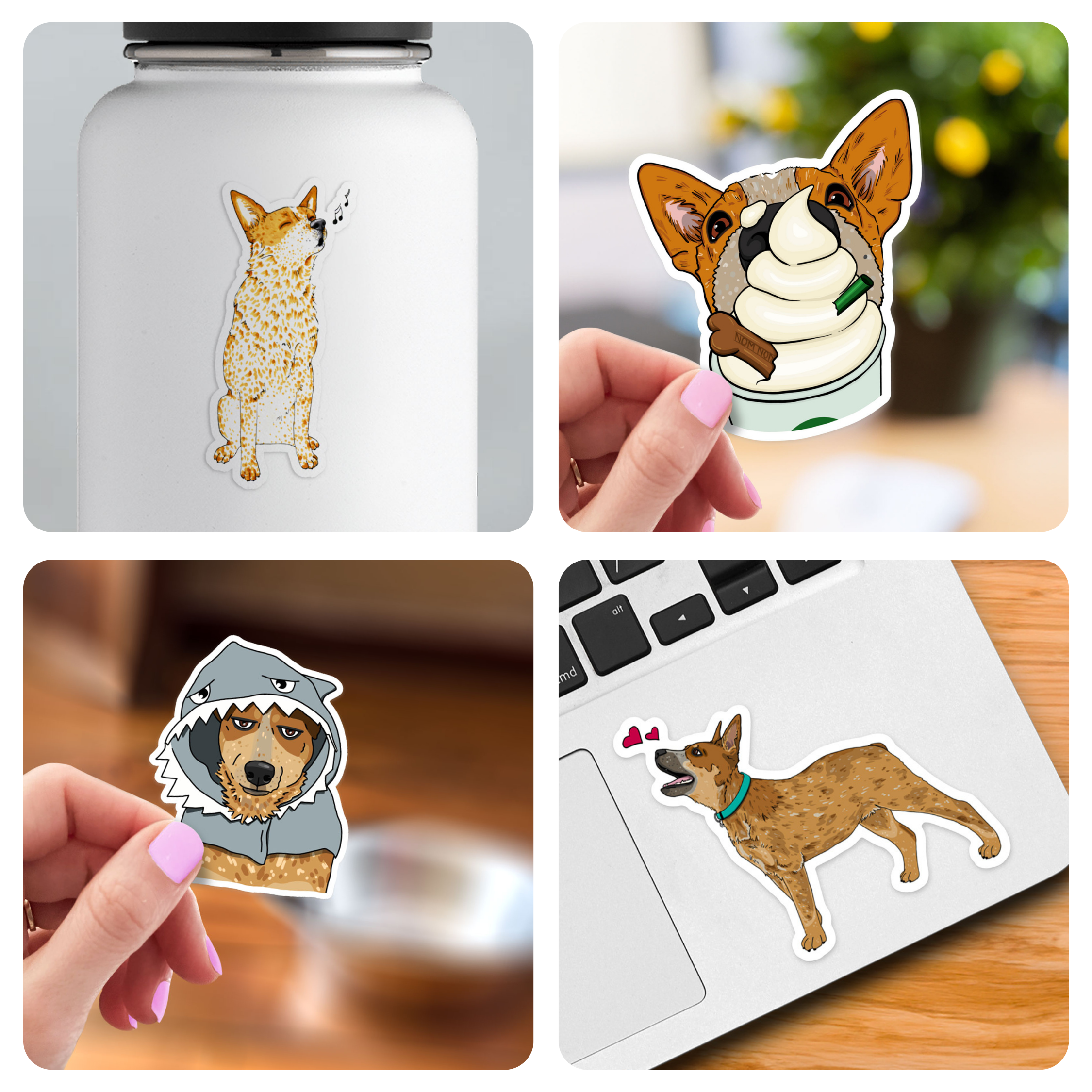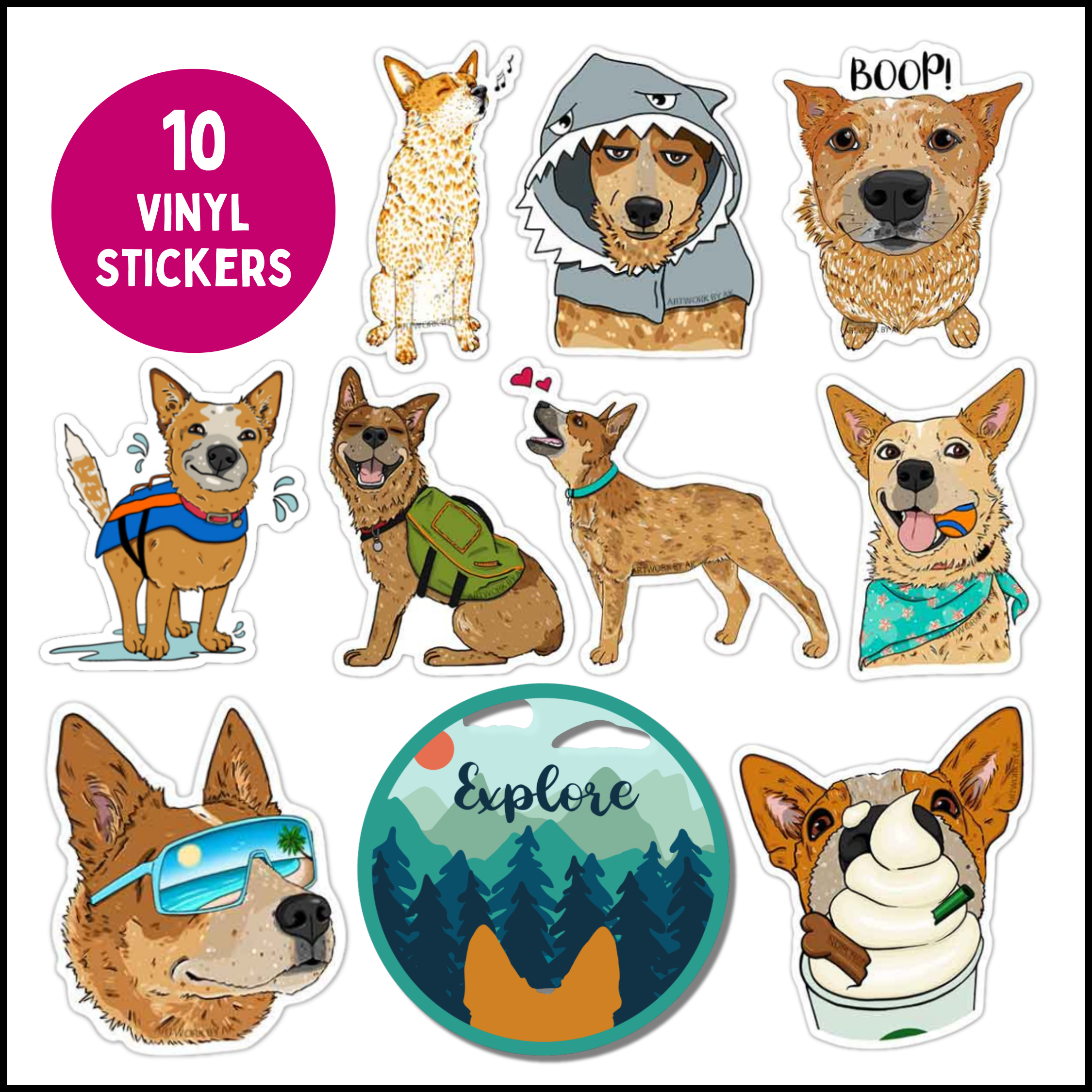 Save on the cutest set of 10 red heeler cattle dog stickers. These make the perfect decals to stick on cars, kayaks, bikes, laptops, water bottles, etc.