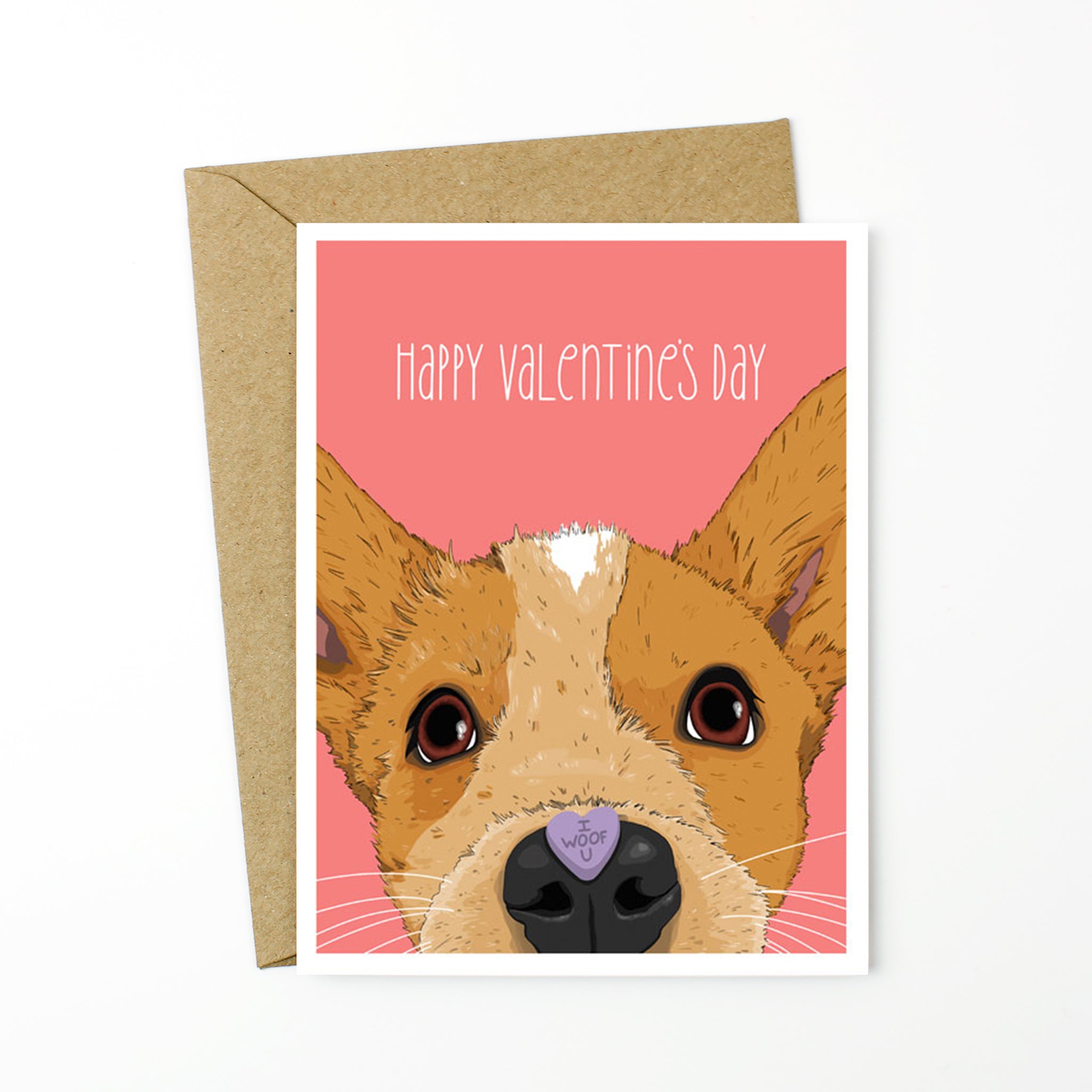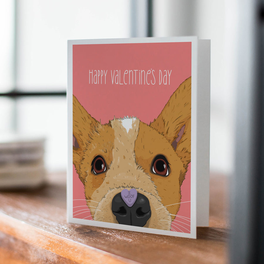 A red heeler with a valentine candy message "I Woof U" on its nose. This cattle dog image makes for such a sweet love or Valentine's Day card to send to a sibling, significant other, or friend.