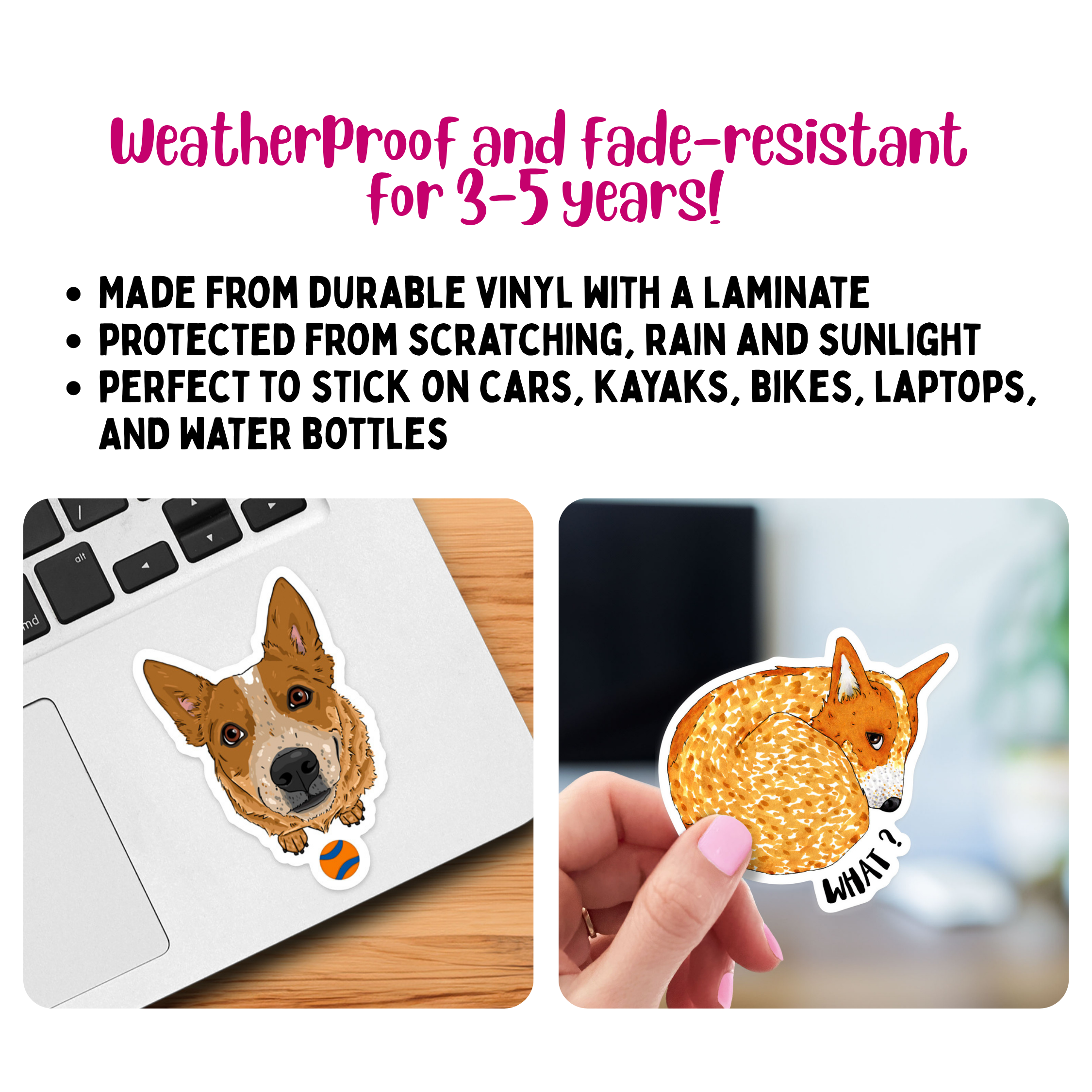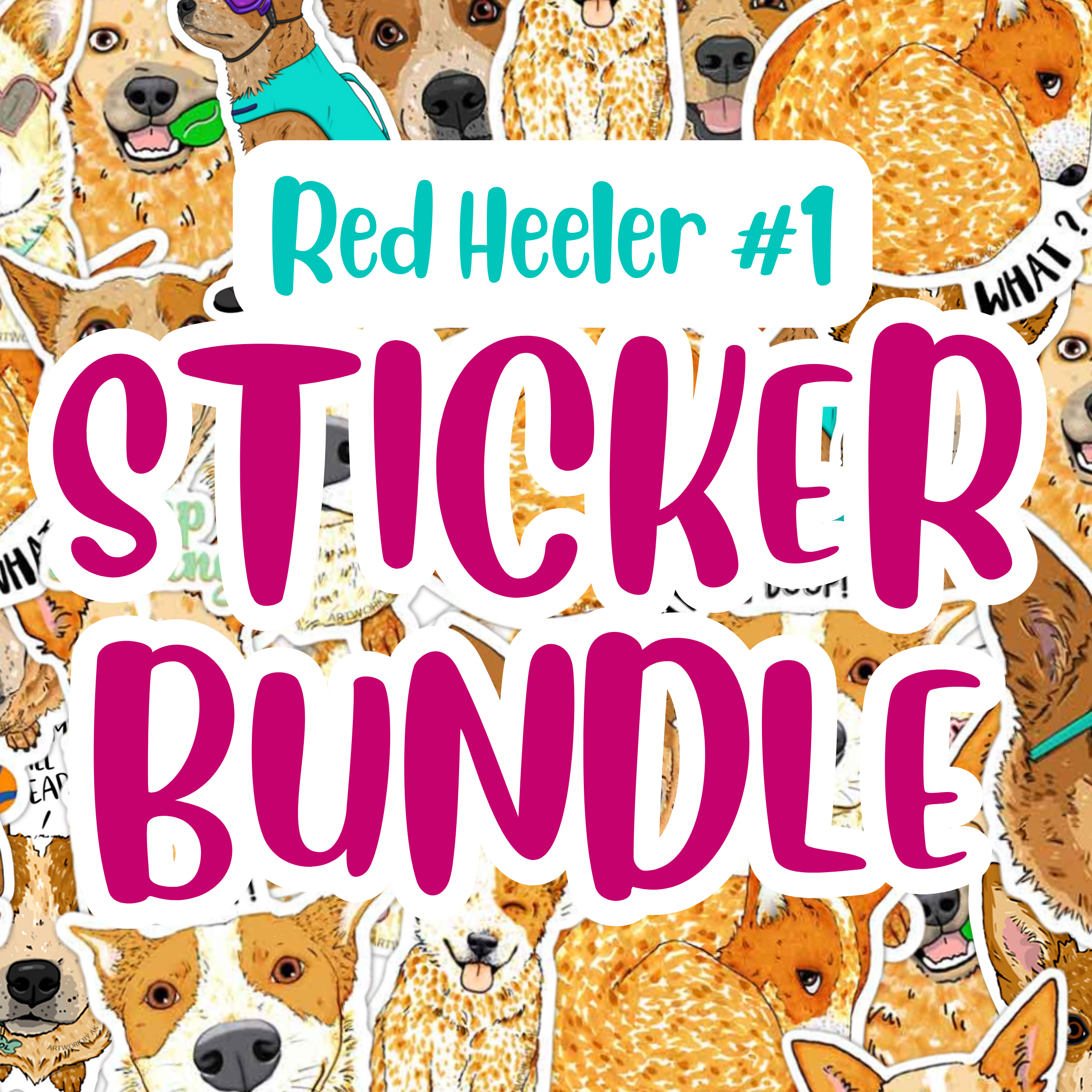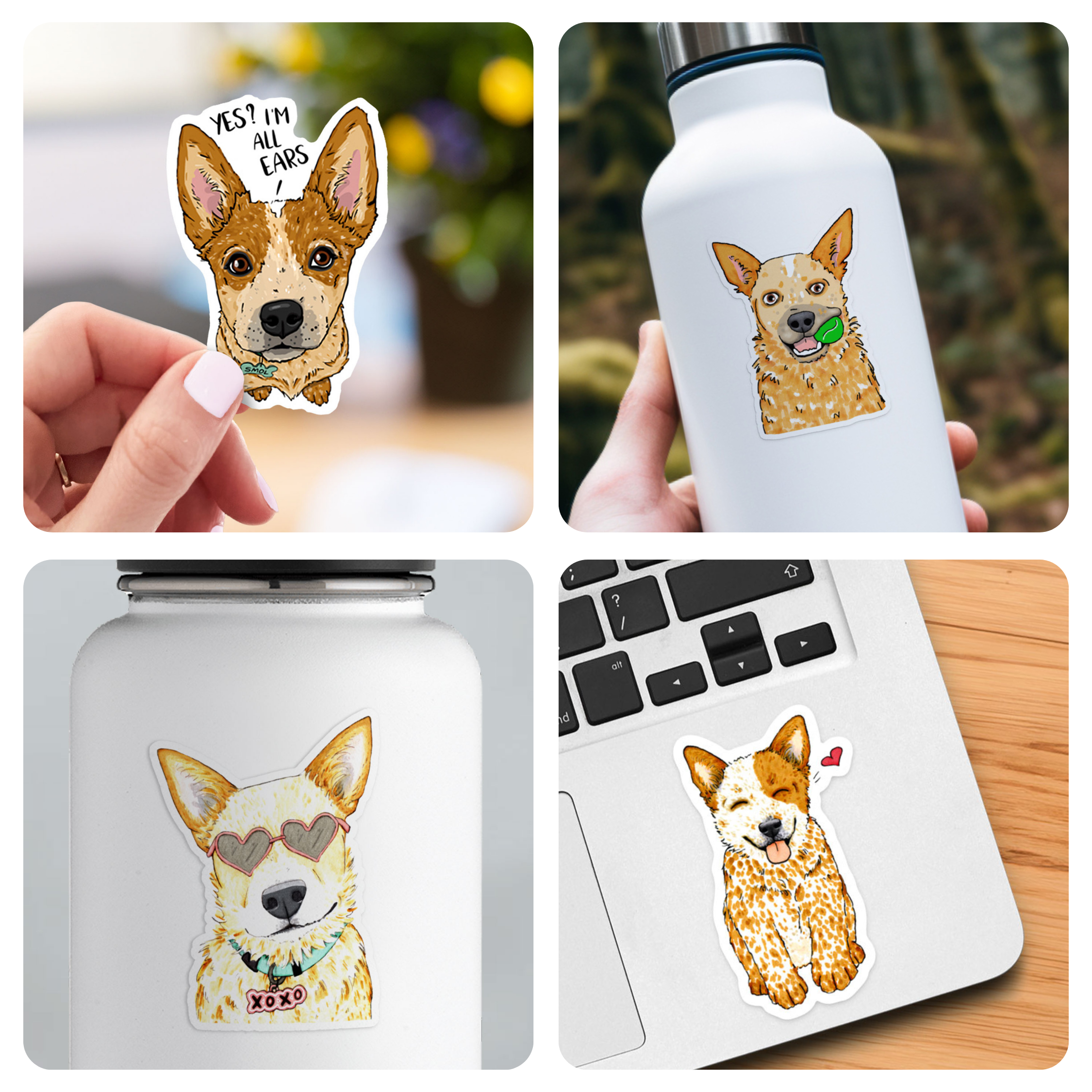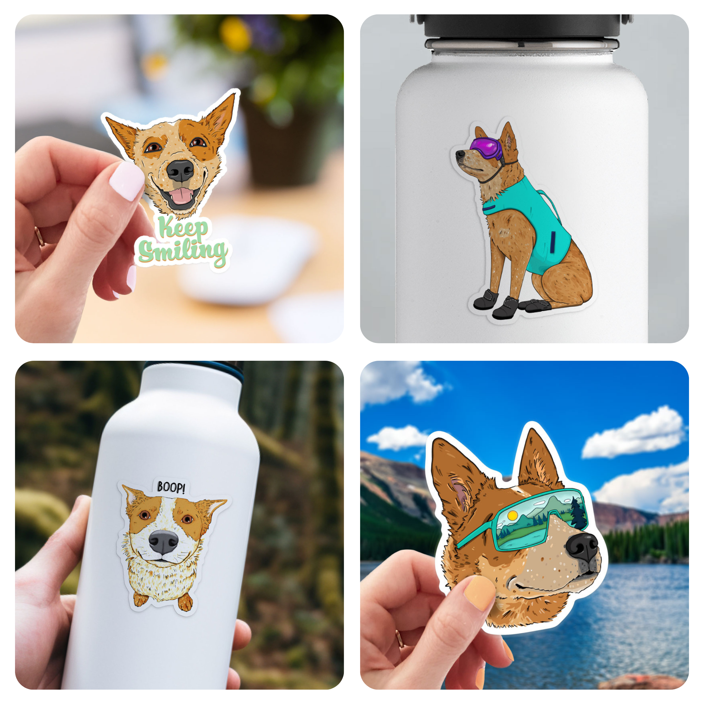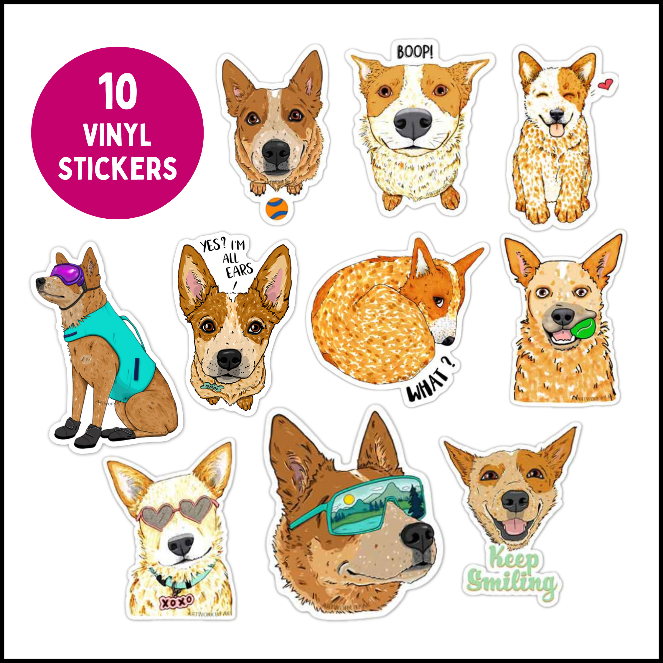 Save on the cutest set of 10 red heeler cattle dog stickers. These make the perfect decals to stick on cars, kayaks, bikes, laptops, water bottles, etc.